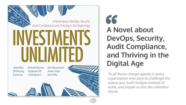 aspects of DevOps: flow, feedback, and continuous learning.” “Yeah, the three ways.” “You betcha. Well, those same concepts can be applied to Security, Compliance, Risk and any other stakeholder along a value stream. These days, I’d argue that Development versus Operations is mostly solved. Now it’s all about systematically looking at all other parties that ensure the quality of software and including them in our shift-left mentality.” 30