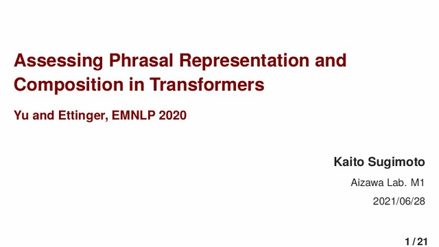 あるフレーズに対し て, それを含むさまざまな例文の情報を使えればもっと良い埋め 込みになりそう • タスクで fine-tuning するとどうなるか? →続編が出ていた: On the Interplay Between Fine-tuning and Composition in Transformers (https://arxiv.org/abs/2105.14668, ACL 2021 Findings) 21 / 21