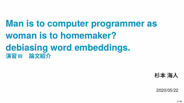 debiasing word embeddings. 演習 III 論文紹介 杉本 海人 2020/05/22 1 / 14