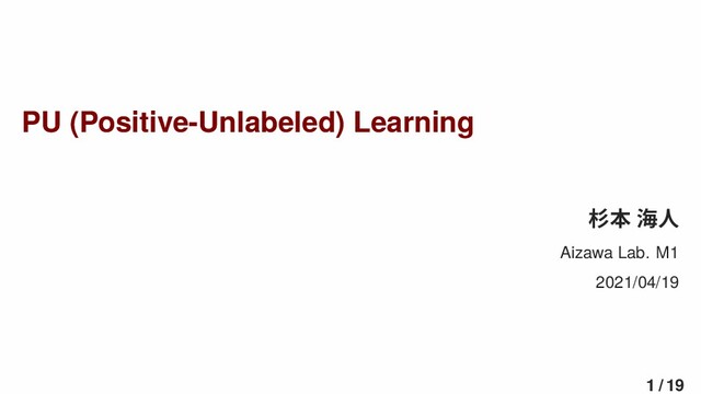 Classifiers from Only Positive and Unlabeled Data (KDD 2008) https://cseweb.ucsd.edu/~elkan/posonly.pdf • Analysis of Learning from Positive and Unlabeled Data (NIPS 2014) https://papers.nips.cc/paper/2014/file/ 35051070e572e47d2c26c241ab88307f-Paper.pdf • Semi-Supervised Classification Based on Classification from Positive and Unlabeled Data (ICML 2017) https://arxiv.org/abs/1605.06955 • Classification from Positive, Unlabeled and Biased Negative Data (ICML 2019) https://arxiv.org/abs/1810.00846 19 / 19