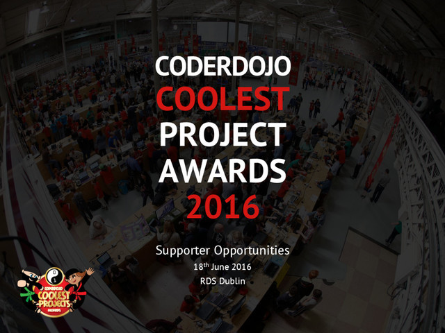 2016 CoderDojo Coolest Projects Awards. If you are interested in pursuing one of these sponsorship opportunities please get involved email: [email protected] Our Location CoderDojo Founation Dogpatch Labs Custom House Quay Dublin 1 Web [email protected] www.coolestprojects.org www.coderdojo.com @coolestprojects / @coderdojo