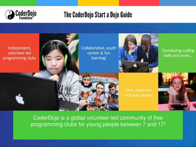 experience to having a working interactive web site they’ve build by hand” Craig, Mentor “I thought it was cool how all the apps worked, so when I heard about the Dojo I wanted to start coming. Today I’m using Xcode and writing a calculator in Objective-C” Ted, attendee “I’m excited to bring the coding culture into the lives of young people here (in Hong Kong)” Tim, Champion “We have a rule at our Dojo, if you didn’t make it you can’t play it” John, Mentor “One of the things that he looked forward to was his weekly trip to CoderDojo. He feels at home in the environment” Ken, Parent of child on autistic spectrum “His Mum loves taking him and was telling me recently that his bedtime reading is a HTML book” Hannah, Champion “It’s good that I can make stuff. I can have an idea in my head and I can actually make it happen!” Tyriah, Attendee & Young Champion “CoderDojo has definitely influenced my thoughts on college….made me look into an area I wouldn’t have considered before” Catrina, Attendee