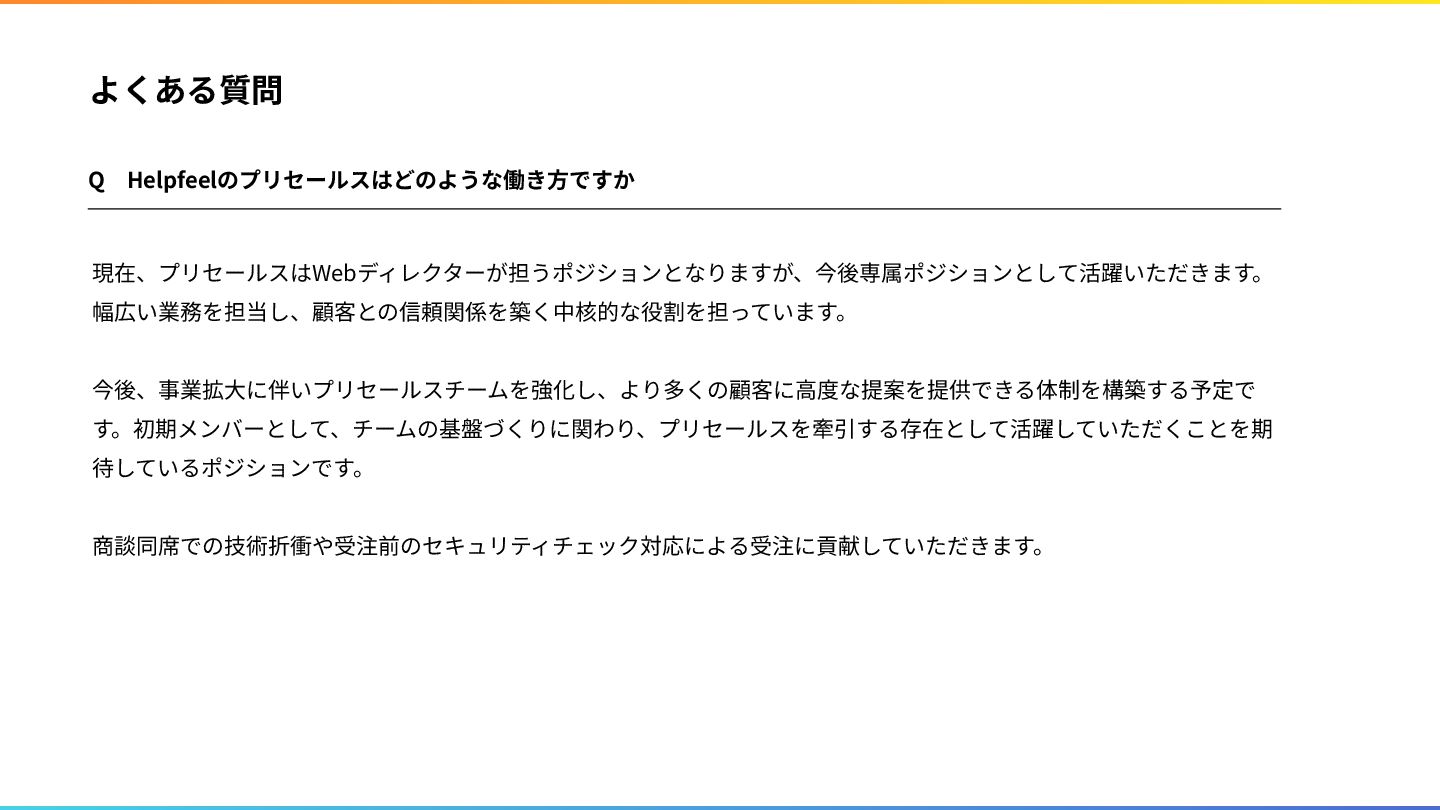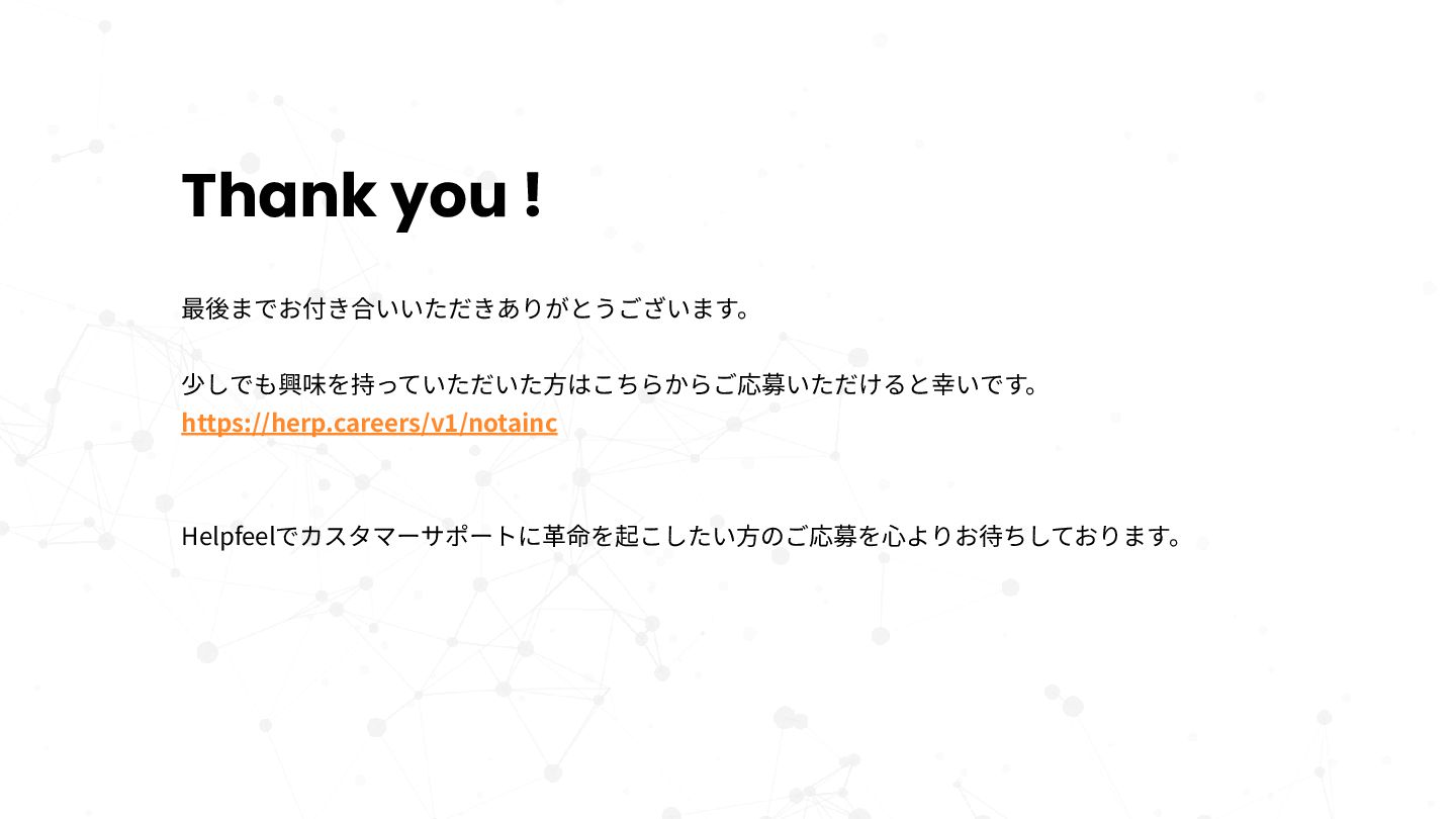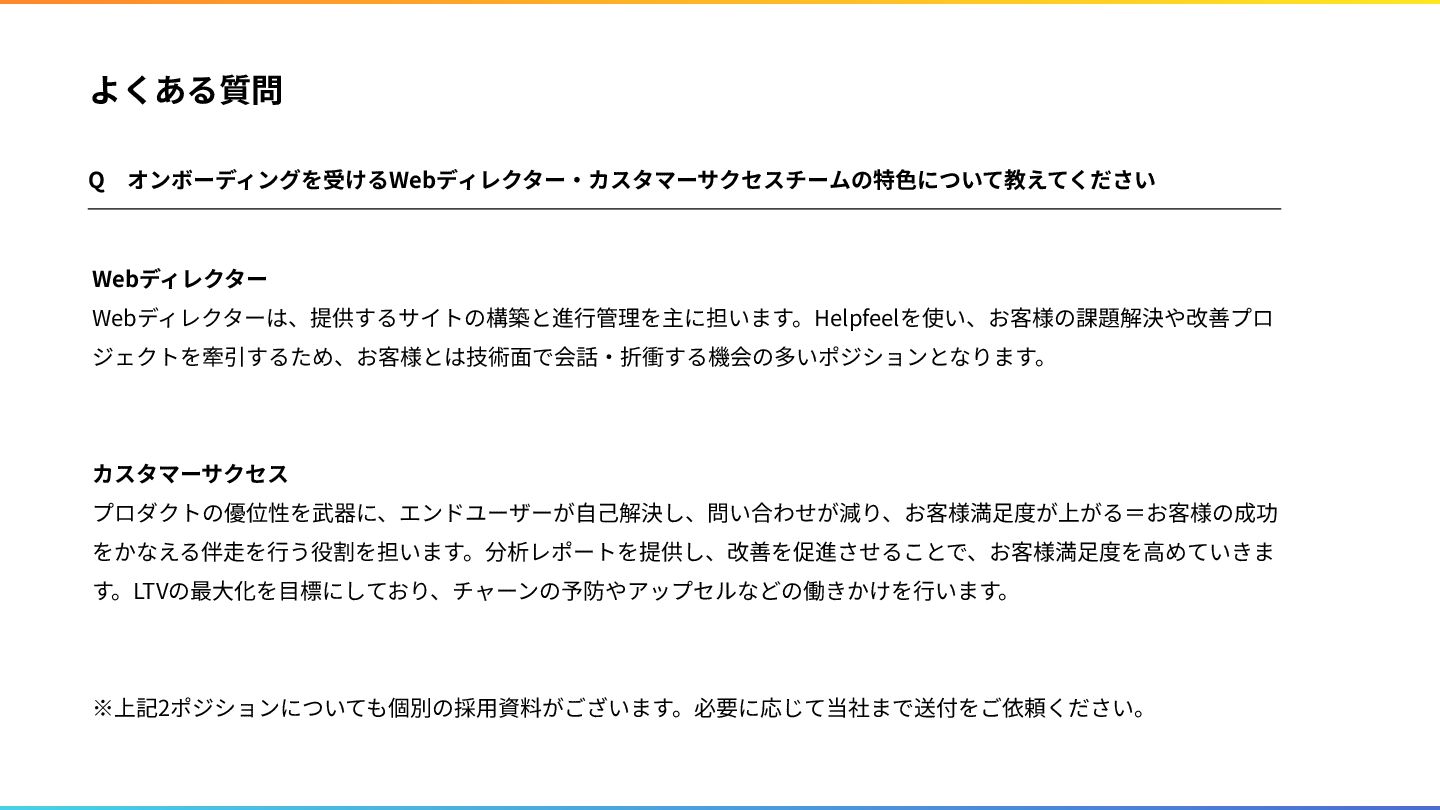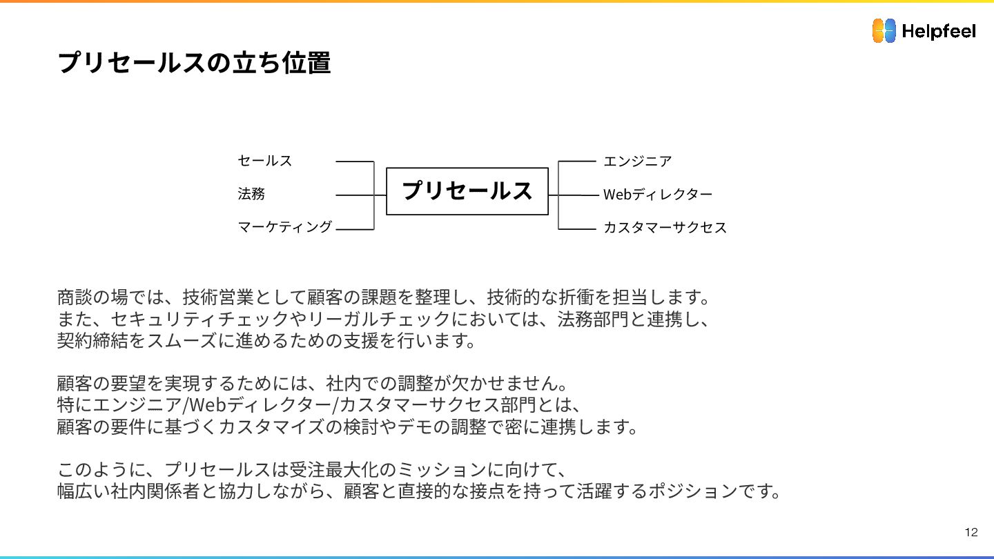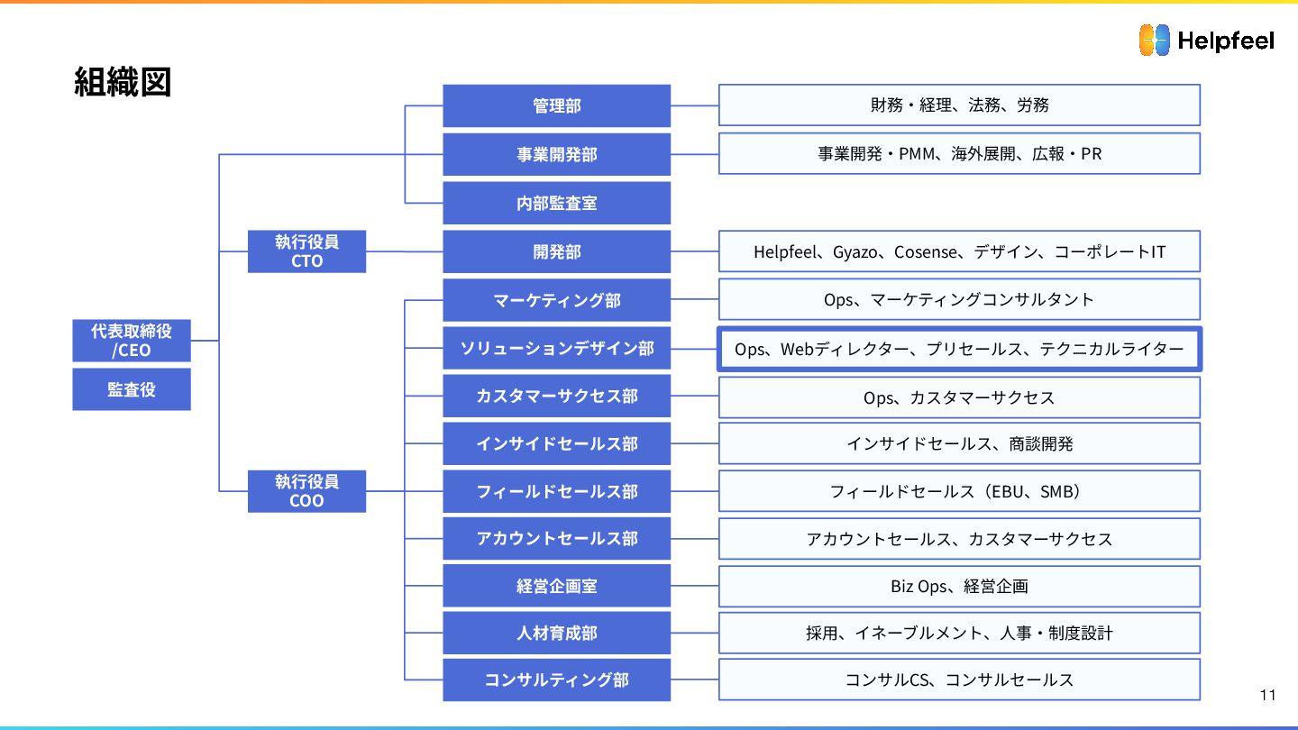 監査役 ソリューションデザイン部 カスタマーサクセス部 フィールドセールス部 アカウントセールス部 経営企画室 ⼈材育成部 コンサルティング部 財務‧経理、法務、労務 事業開発‧PMM、海外展開、広報‧PR Helpfeel、Gyazo、Cosense、デザイン、コーポレートIT Ops、Webディレクター、プリセールス、テクニカルライター Ops、カスタマーサクセス インサイドセールス、商談開発 フィールドセールス(EBU、SMB) アカウントセールス、カスタマーサクセス Biz Ops、経営企画 採⽤、イネーブルメント、⼈事‧制度設計 コンサルCS、コンサルセールス 執⾏役員 CTO 執⾏役員 COO Ops、マーケティングコンサルタント