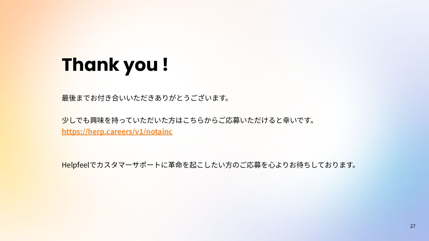 マネージャー兼 AIエキスパートエンジニア AIエンジニア AIエンジニア IPA ※IPA未踏事業に採択経験があるエンジニアが5名(スーパークリエーター認定2名含む)在籍する国内屈 指の開発チーム。テクニカルフェローの増井は未踏プロジェクトマネージャーを務めていました。 寺本 ⼤輝 飯塚 ⼤貴 SAIER Tarek ⾃然⾔語処理の学術レベルのスペシャリストが多数在籍 iPhoneのフリック⼊⼒、意図予測変換機能と共通する技術基盤を有する Helpfeelの 特許技術である意図予測検索 を開発。 代表取締役CEO 執⾏役員CTO テクニカルフェロー IPA 洛⻄ ⼀周 秋⼭ 博紀 増井 俊之 特許技術を⽣んだ国内最⾼峰 の開発チーム ※ IPA 経済産業省 IPA 未踏ソフトウェアエンジニア6名以上在籍
