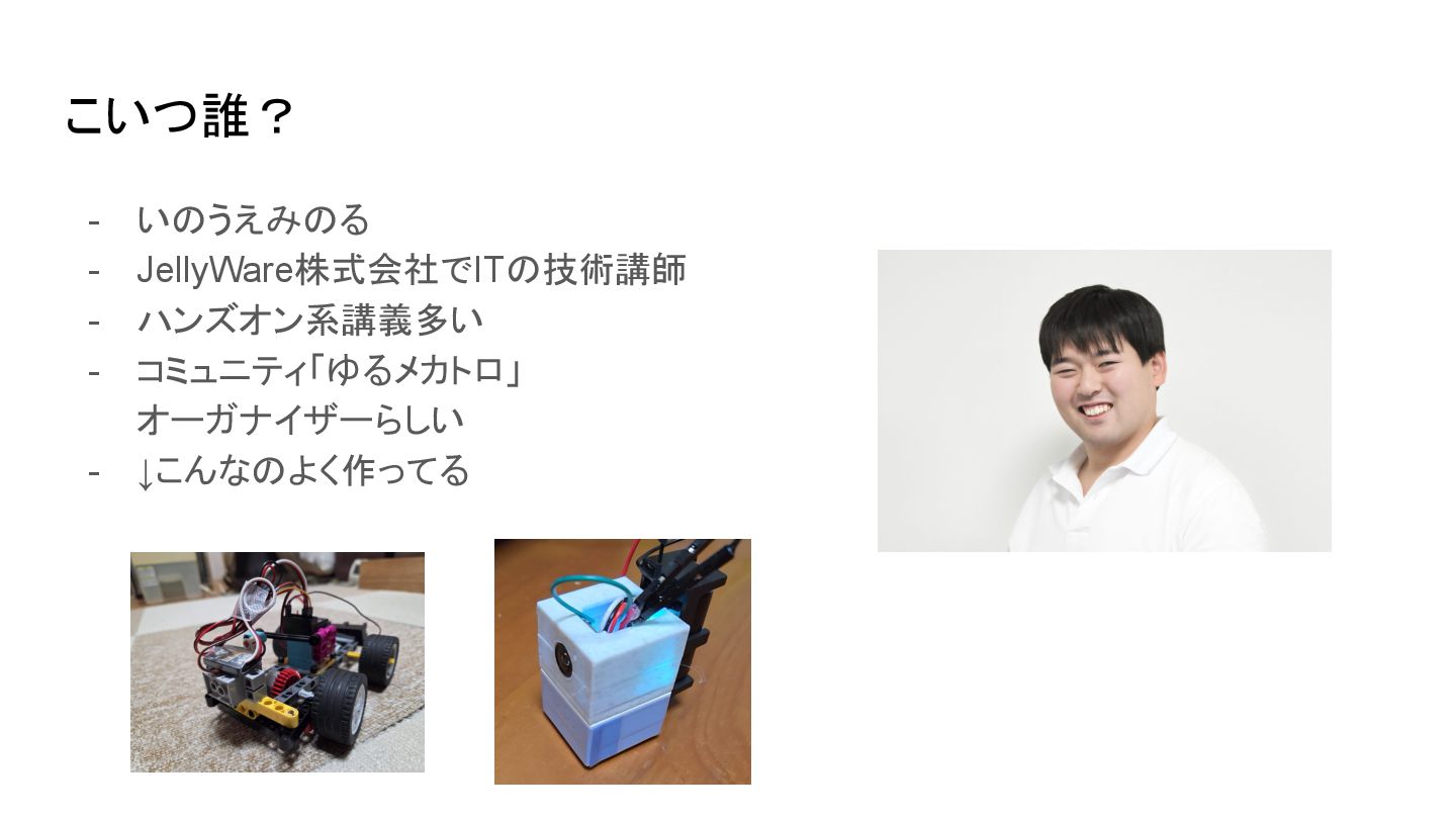 こいつ誰? - いのうえみのる - JellyWare株式会社でITの技術講師 - ハンズオン系講義多い - コミュニティ「ゆるメカトロ」 オーガナイザーらしい