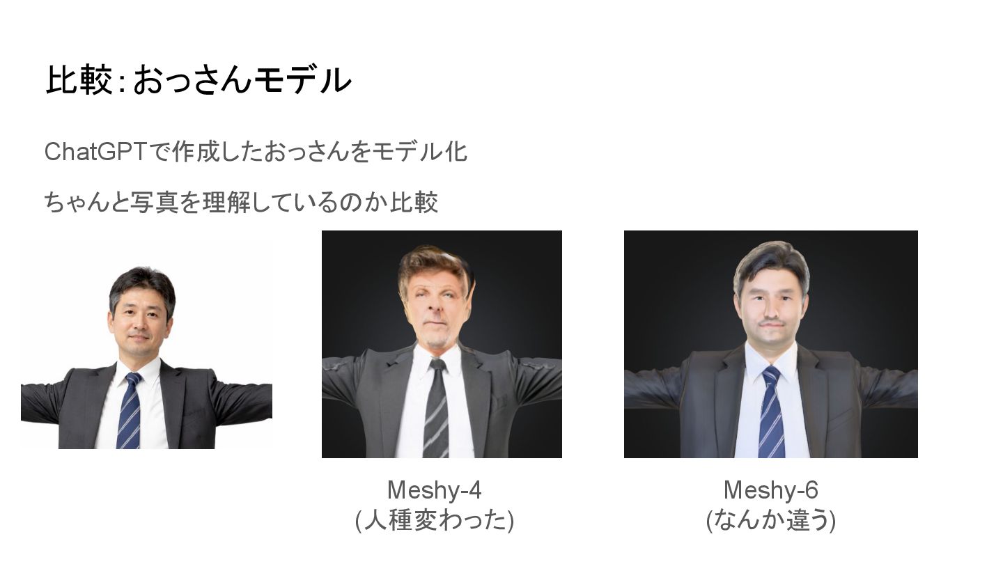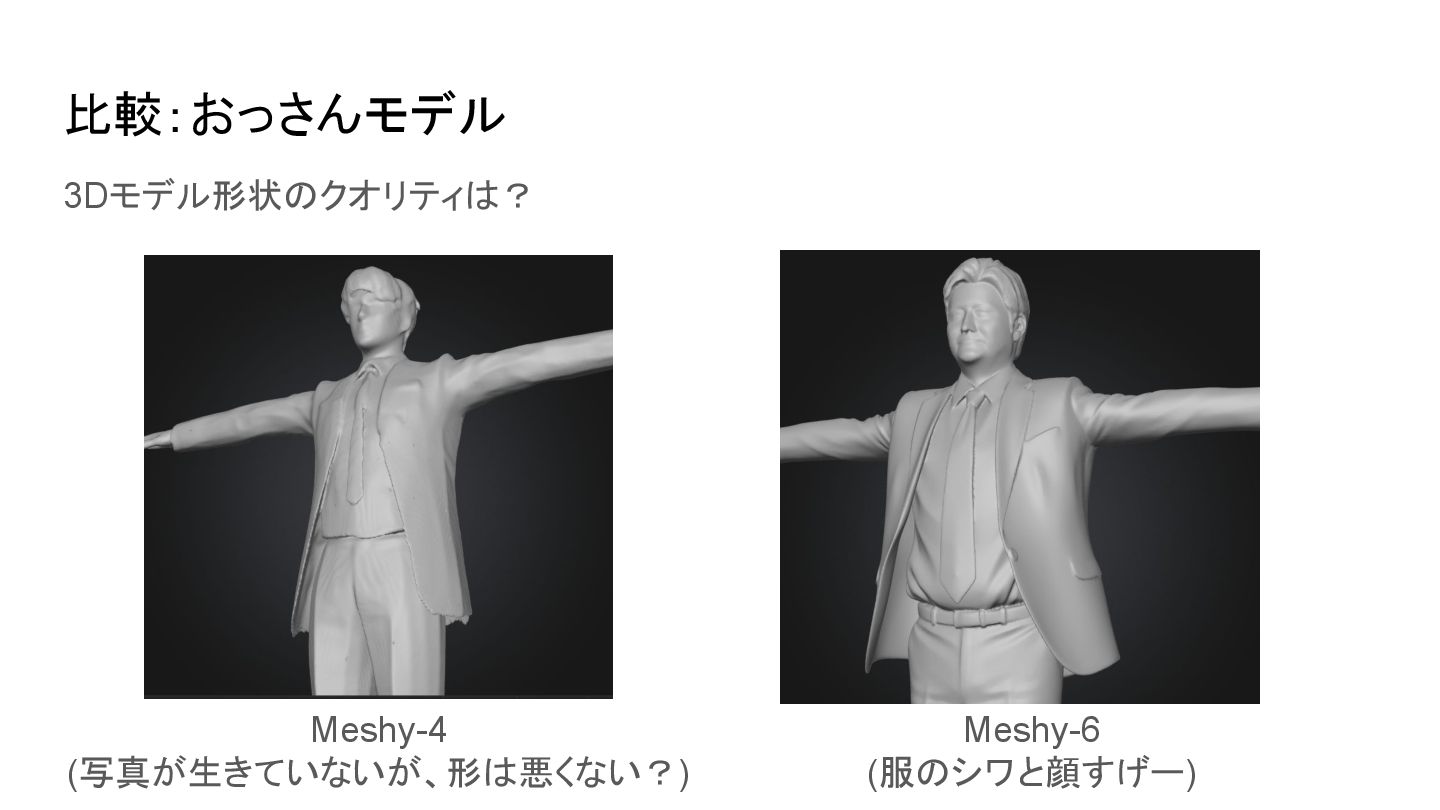 比較:おっさんモデル 3Dモデル形状のクオリティは? Meshy-6 (服のシワと顔すげー) Meshy-4 (写真が生きていないが、形は悪くない?)