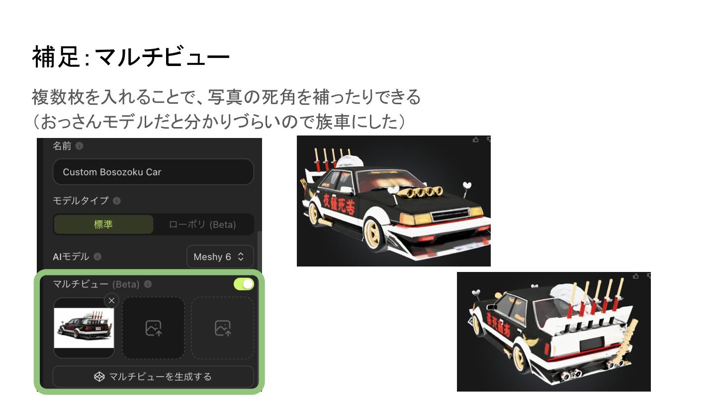 補足:マルチビュー 複数枚を入れることで、写真の死角を補ったりできる (おっさんモデルだと分かりづらいので族車にした)