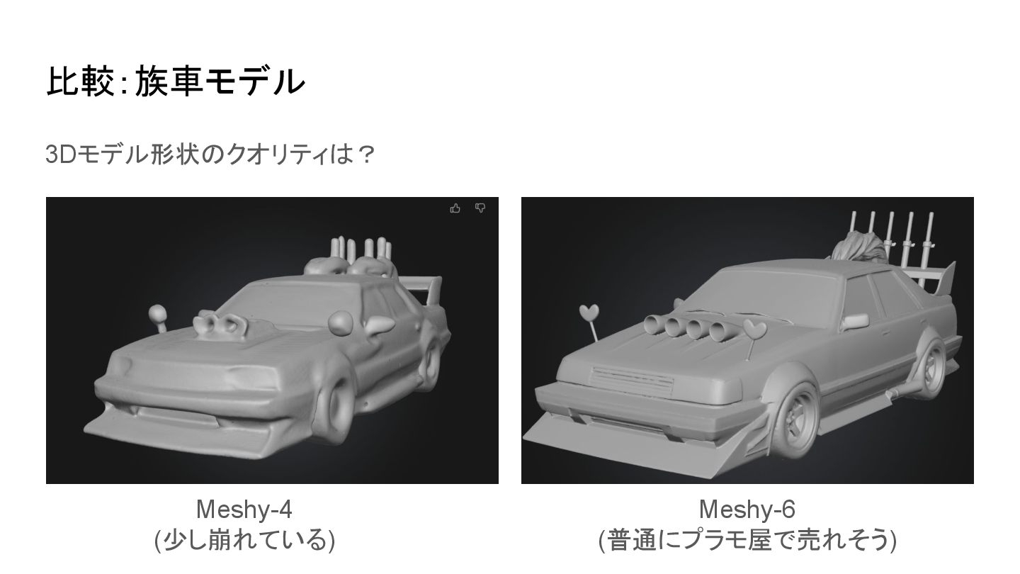 比較:族車モデル 3Dモデル形状のクオリティは? Meshy-4 (少し崩れている) Meshy-6 (普通にプラモ屋で売れそう)