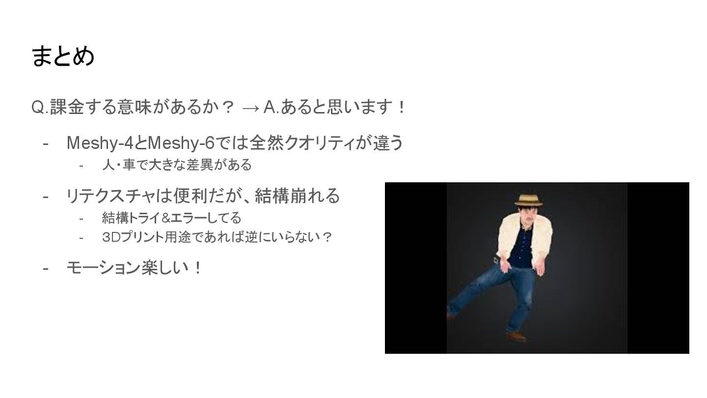 まとめ Q.課金する意味があるか? → A.あると思います! - Meshy-4とMeshy-6では全然クオリティが違う - 人・車で大きな差異がある - リテクスチャは便利だが、結構崩れる