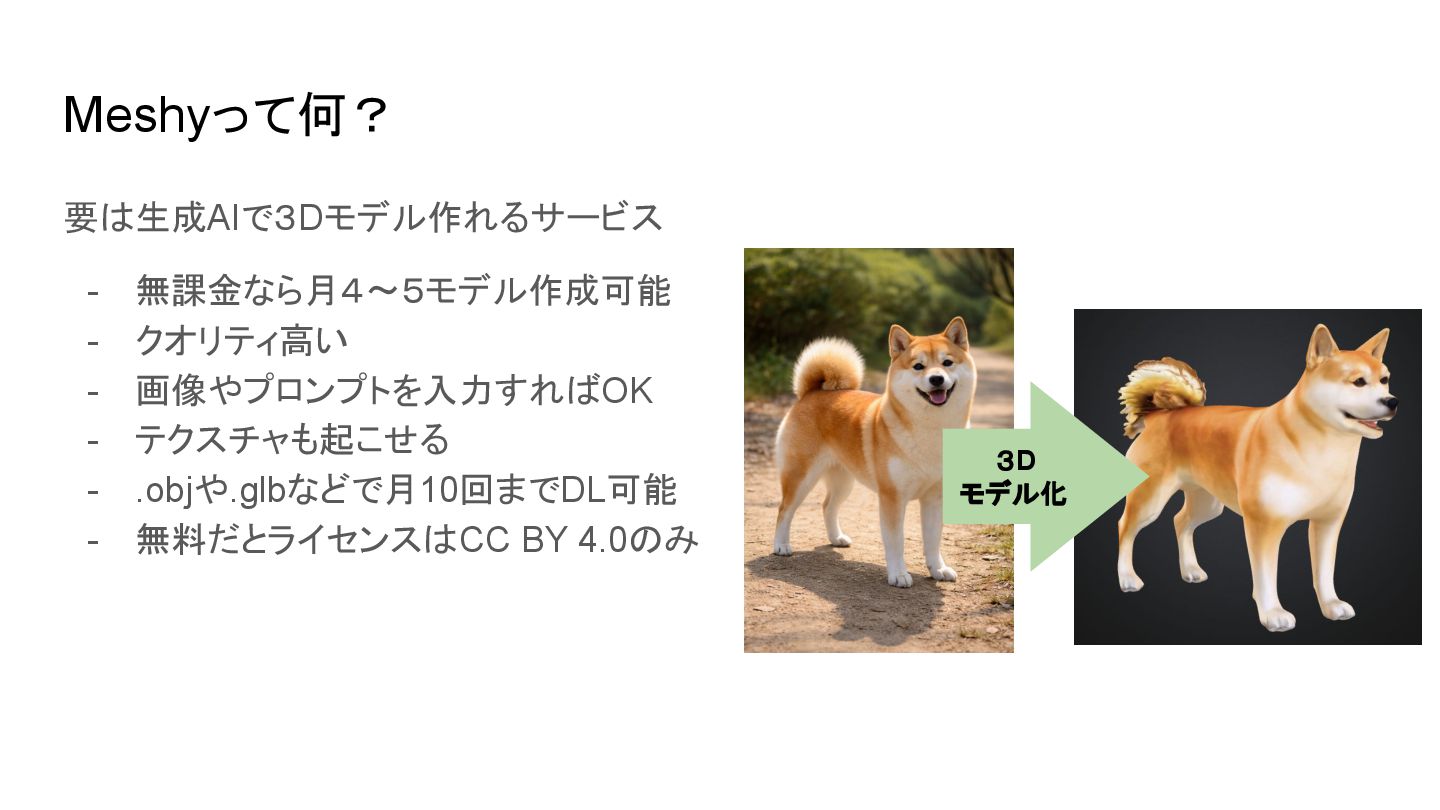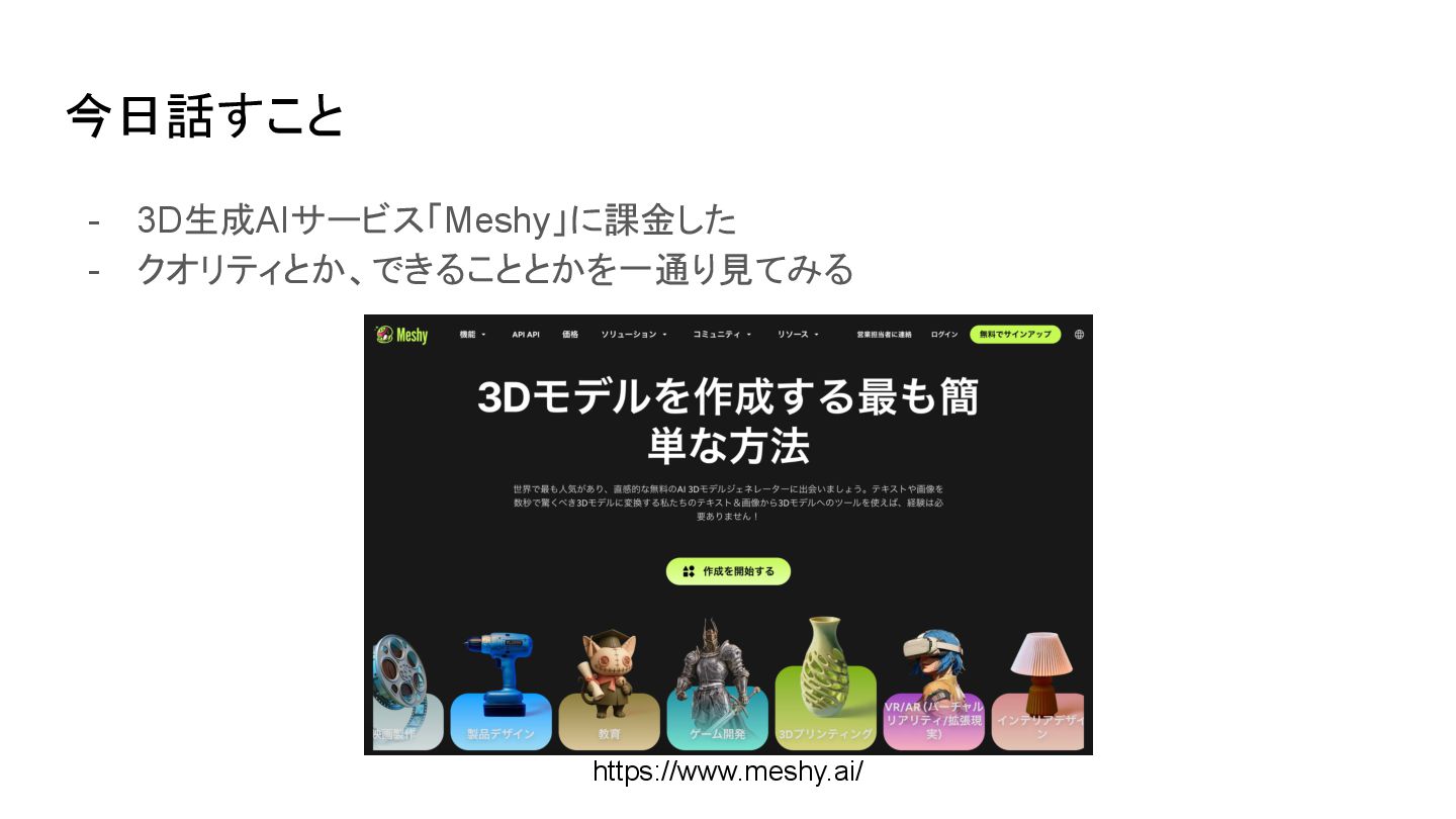 今日話すこと - 3D生成AIサービス「Meshy」に課金した - クオリティとか、できることとかを一通り見てみる https://www.meshy.ai/