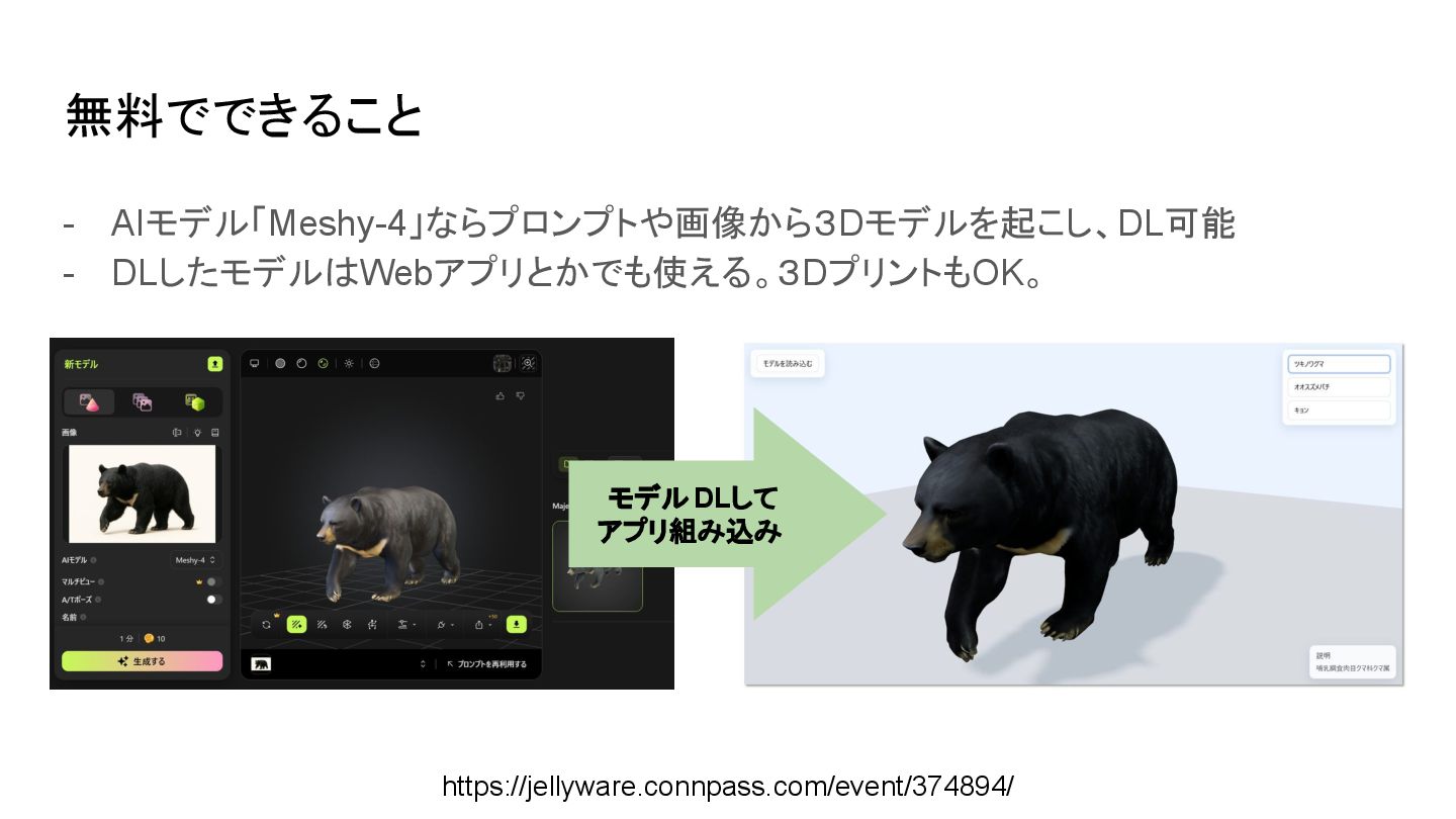 無料でできること - AIモデル「Meshy-4」ならプロンプトや画像から3Dモデルを起こし、DL可能 - DLしたモデルはWebアプリとかでも使える。3DプリントもOK。 https://jellyware.connpass.com/event/374894/ モデルDLして アプリ組み込み