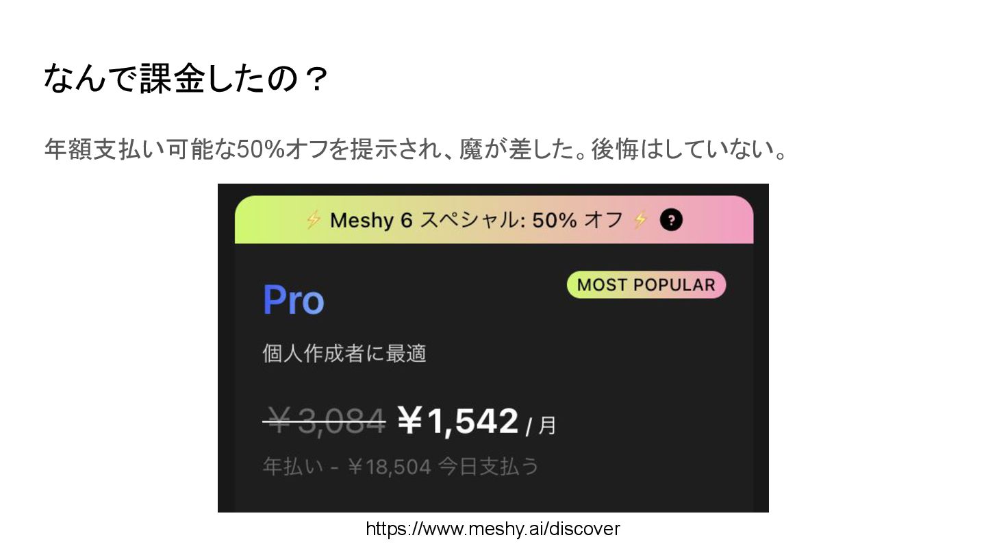 なんで課金したの? 年額支払い可能な50%オフを提示され、魔が差した。後悔はしていない。 https://www.meshy.ai/discover