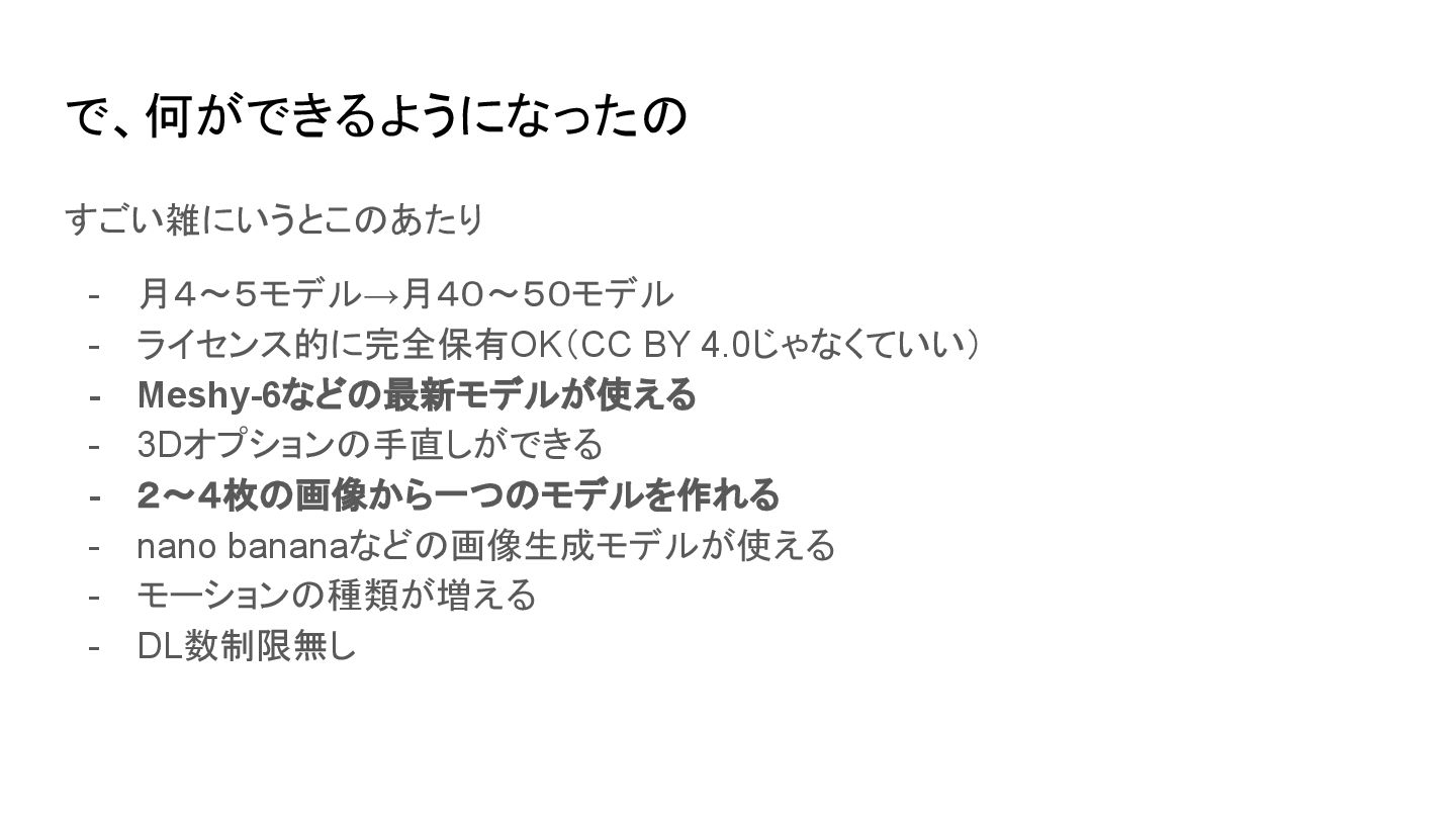 - 3Dオプションの手直しができる - 2〜4枚の画像から一つのモデルを作れる - nano bananaなどの画像生成モデルが使える - モーションの種類が増える - DL数制限無し