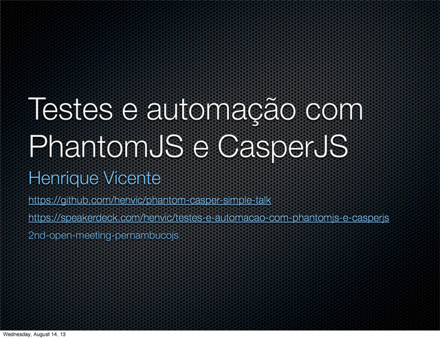 PhantomJS, e mais recentemente também do SlimerJS (baseado em Gecko) Também possui módulos, como o PhantomJS (alguns similares) Wednesday, August 14, 13