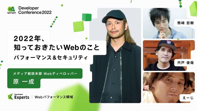 Webパフォーマンス領域のDeveloper Expertsを務める原です。本セッションでは、2022年に知っておきたいWebにまつわる新技術やトピックを、パフォーマンス・セキュリティ領域からピックアップして紹介します。当日は各分野のエキスパートである@sisidovski、@kumagi、@agektmrをお招きして該当トピックの理解を深めます。それに加えサイバーエージェントでのユースケースを紹介し、実サービスでどのように適用できるのかお伝えします。