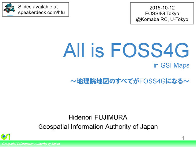 of Japan All is FOSS4G in GSI Maps 〜地理院地図のすべてがFOSS4Gになる〜 Hidenori FUJIMURA Geospatial Information Authority of Japan 1 2015-10-12 FOSS4G Tokyo @Komaba RC, U-Tokyo Slides available at speakerdeck.com/hfu