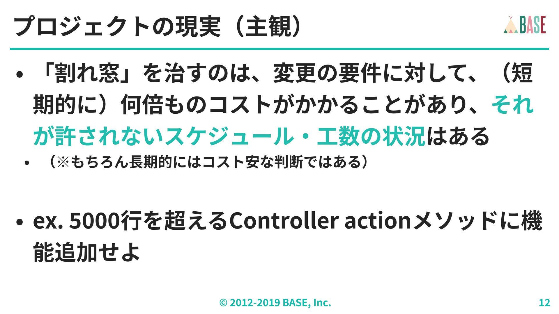 © - BASE, Inc. プロジェクトの現実(主観) • 「割れ窓」を治すのは、変更の要件に対して、(短 期的に)何倍ものコストがかかることがあり、それ が許されないスケジュール‧⼯数の状況はある •
