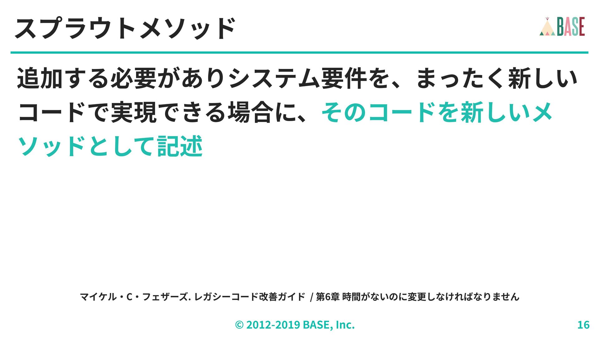 © - BASE, Inc. スプラウトメソッド 追加する必要がありシステム要件を、まったく新しい コードで実現できる場合に、そのコードを新しいメ ソッドとして記述 マイケル‧C‧フェザーズ. レガシーコード改善ガイド