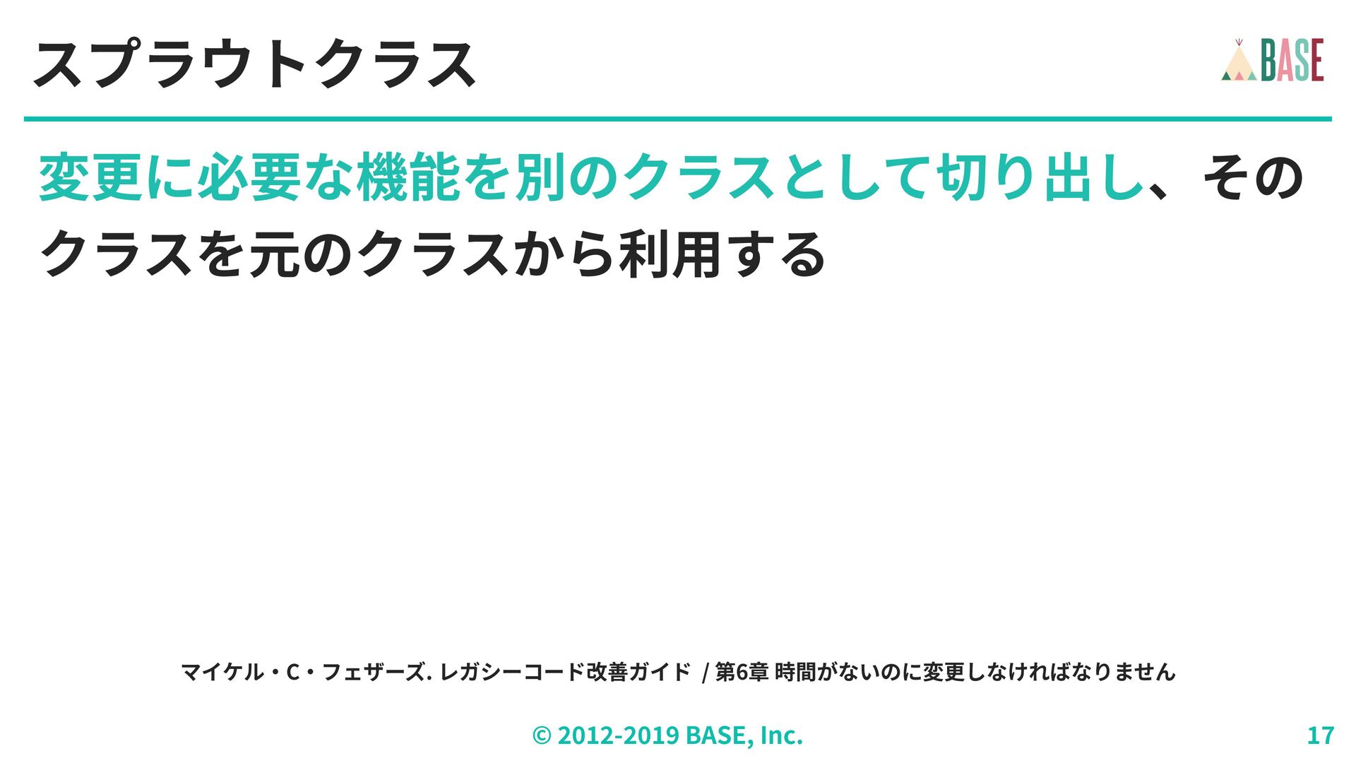 © - BASE, Inc. スプラウトクラス 変更に必要な機能を別のクラスとして切り出し、その クラスを元のクラスから利⽤する マイケル‧C‧フェザーズ. レガシーコード改善ガイド /