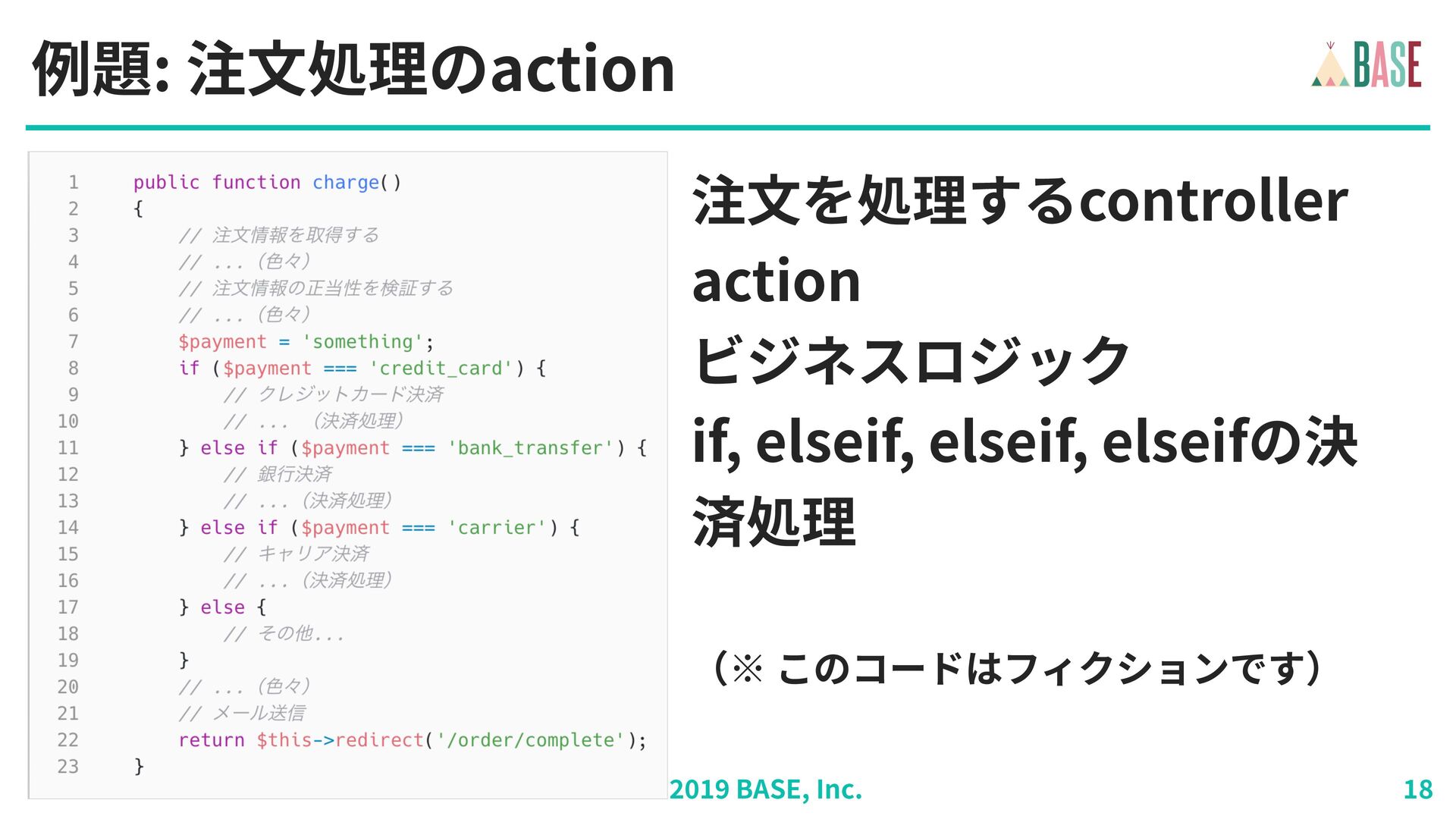 © - BASE, Inc. 例題: 注⽂処理のactionに機能追加 • 「決済バリエーションを追加してほしい」 そもそも根本的に元のコードをどう にかしたほうがいいんだよな