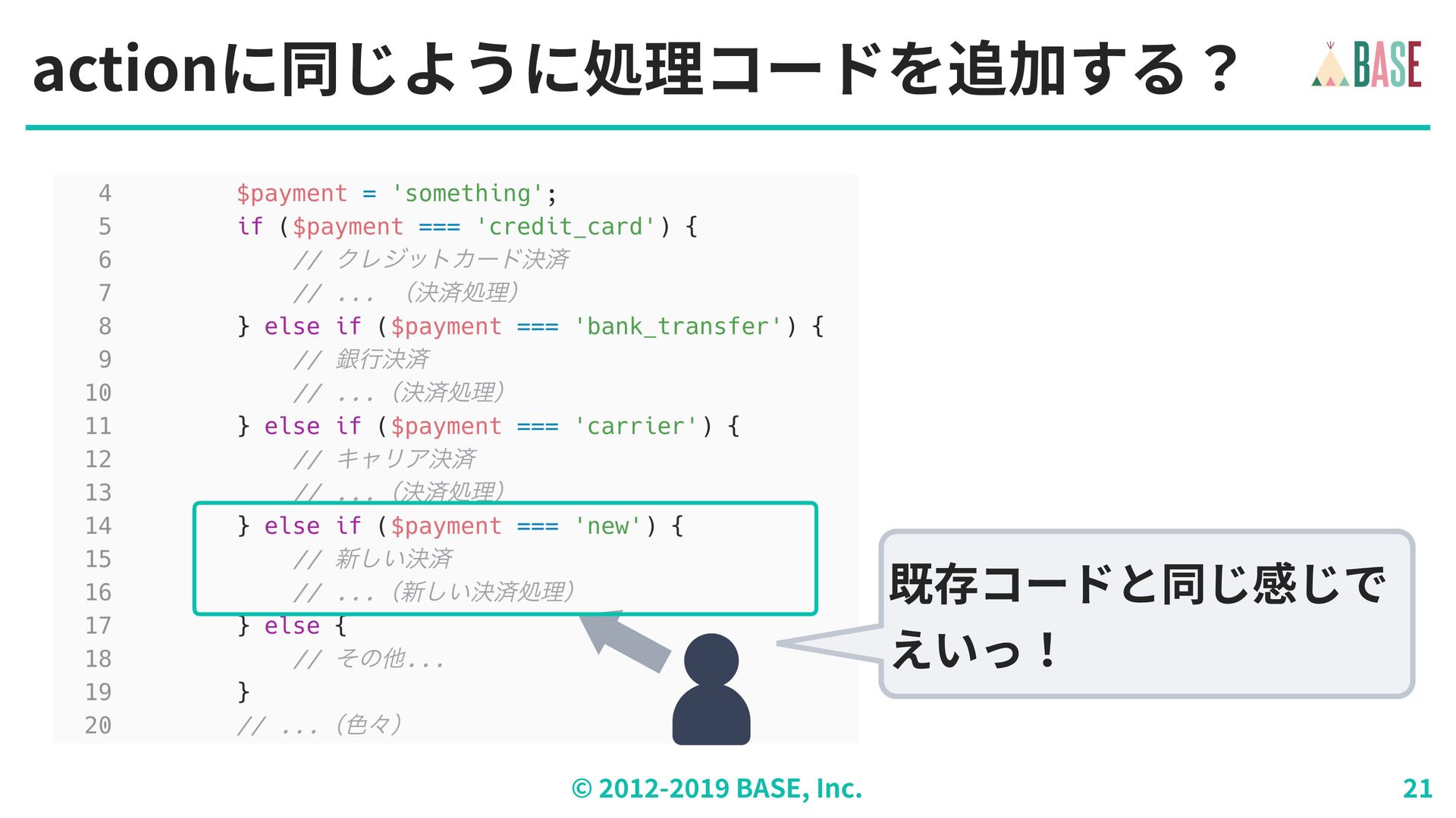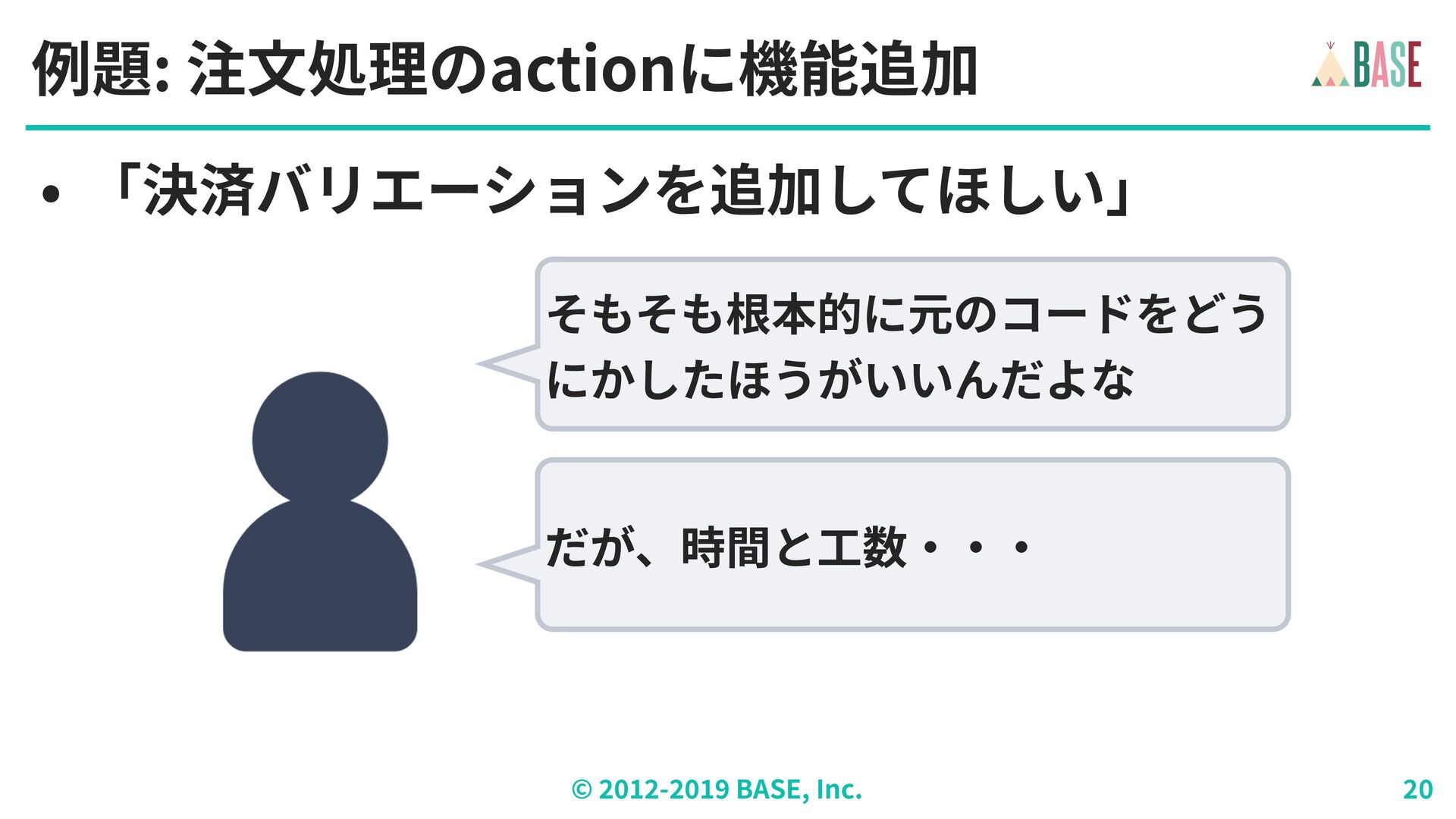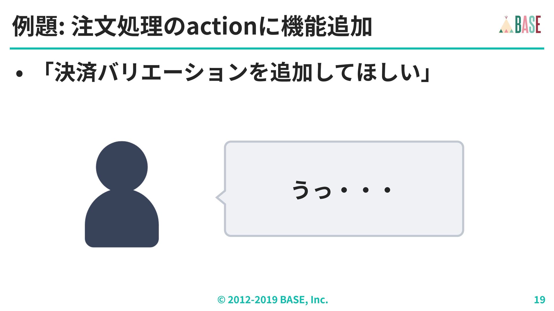 © - BASE, Inc. 例題: 注⽂処理のactionに機能追加 • 「決済バリエーションを追加してほしい」 うっ‧‧‧