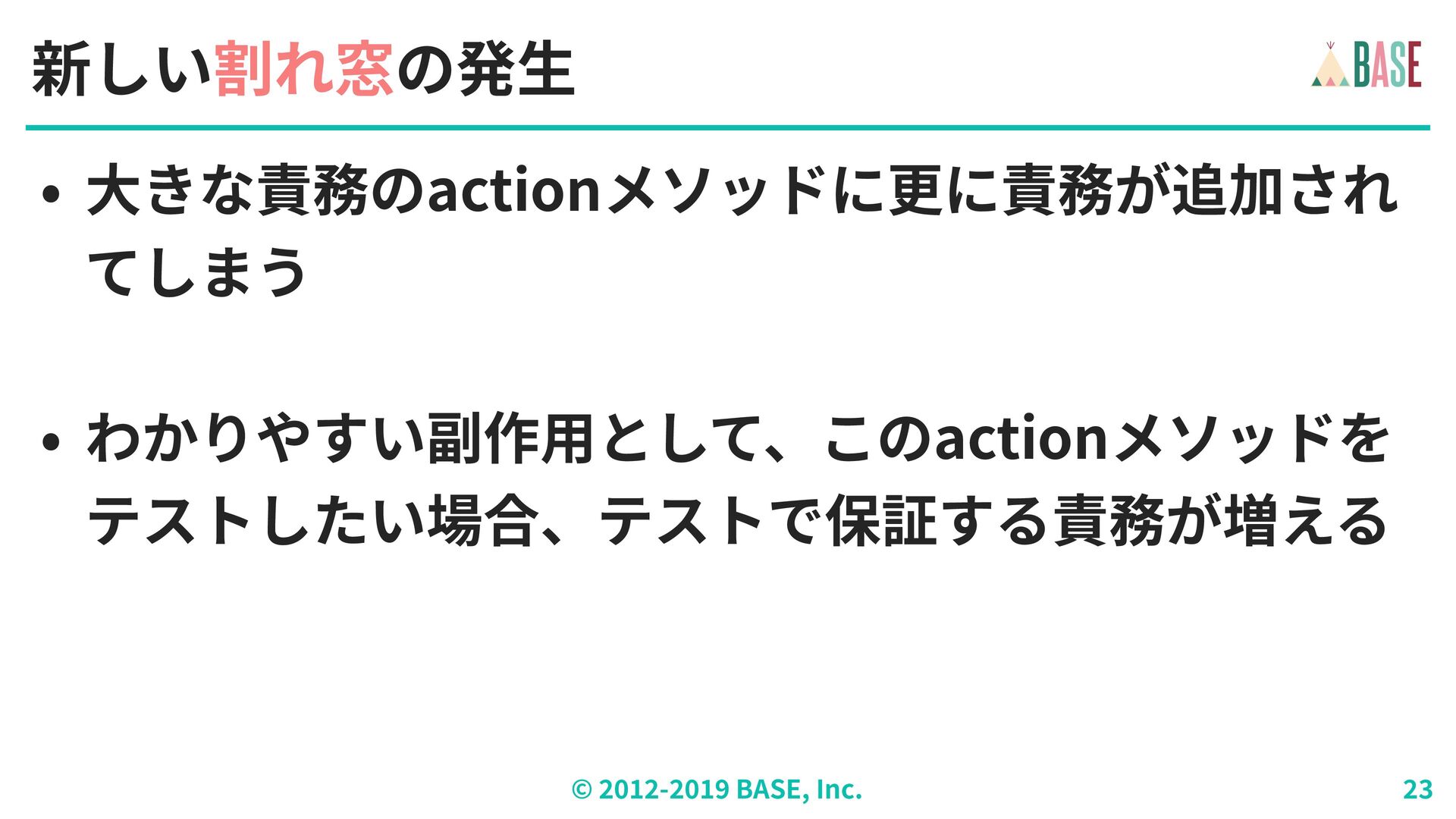 © - BASE, Inc. 新しい割れ窓の発⽣ • ⼤きな責務のactionメソッドに更に責務が追加され てしまう • わかりやすい副作⽤として、このactionメソッドを