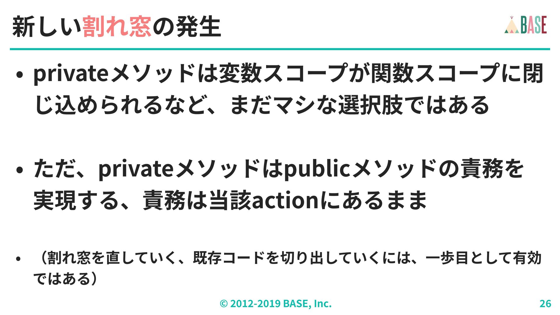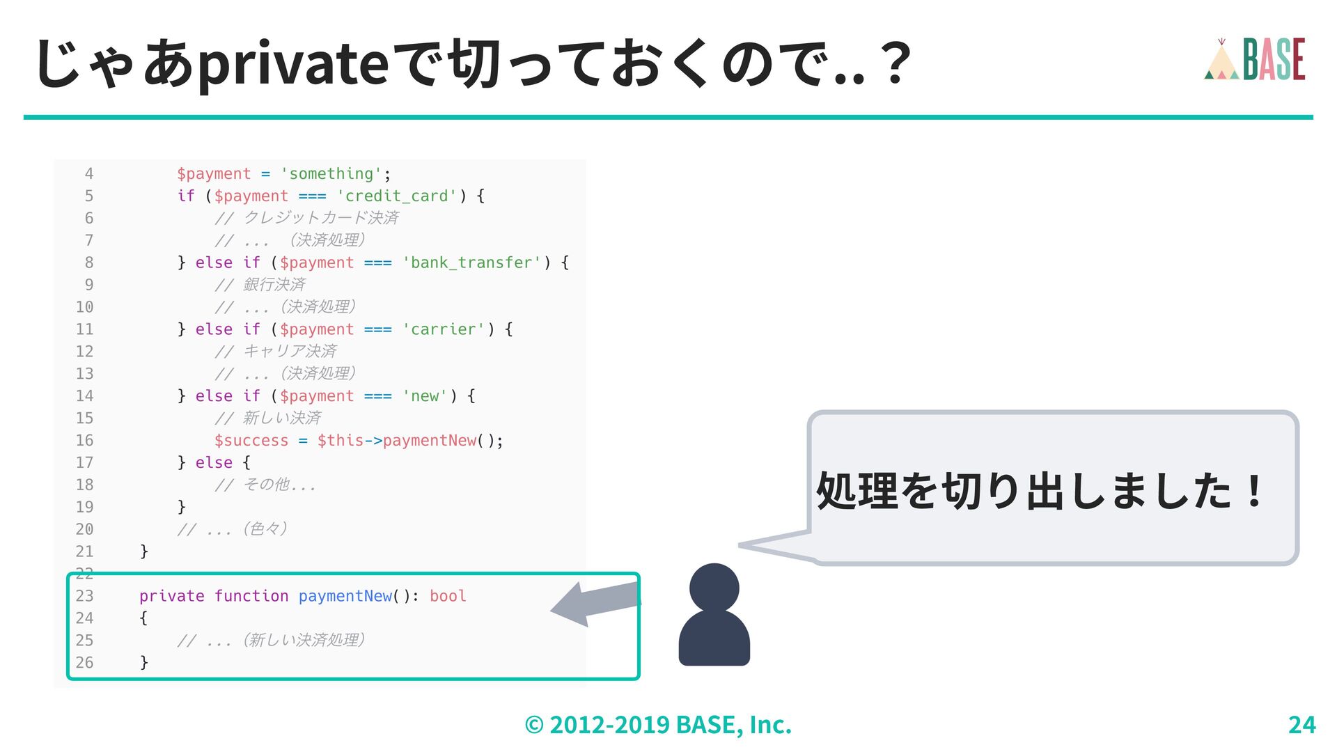 © - BASE, Inc. 新しい割れ窓の発⽣ • privateメソッドは変数スコープが関数スコープに閉 じ込められるなど、まだマシな選択肢ではある • ただ、privateメソッドはpublicメソッドの責務を