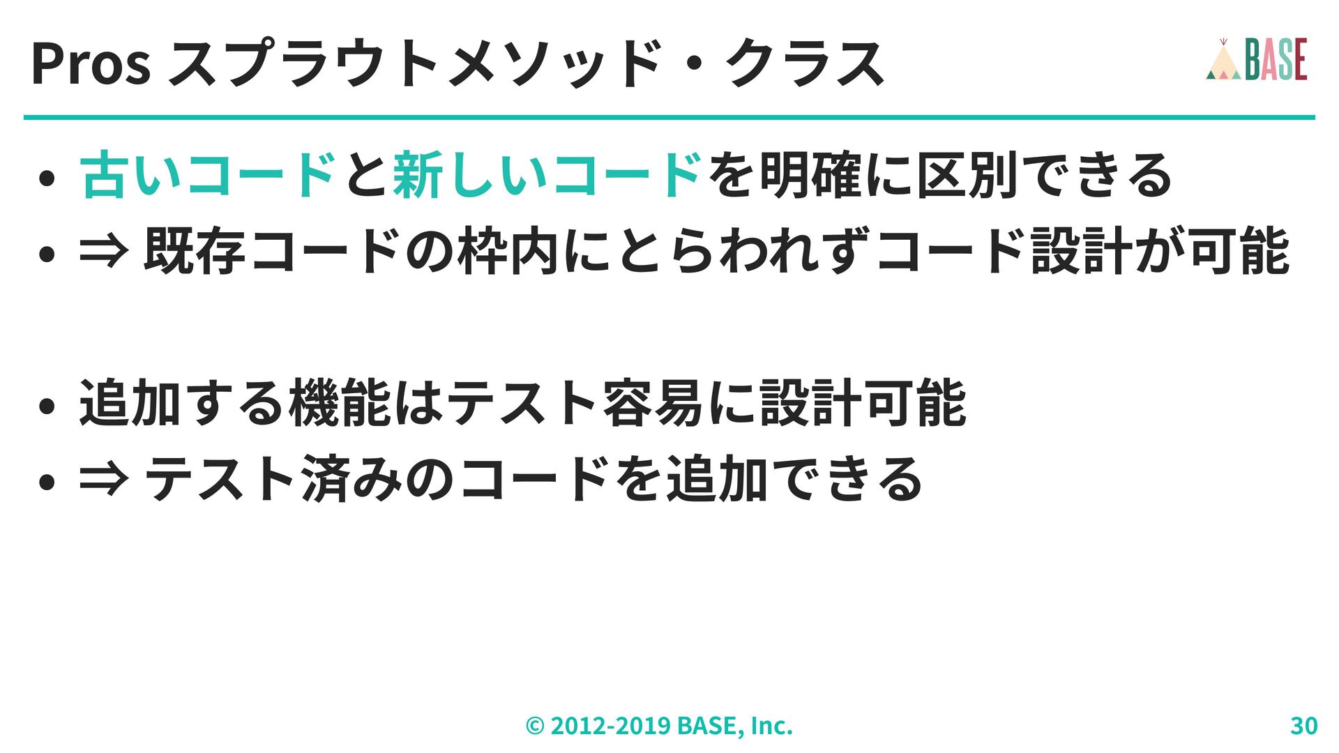 © - BASE, Inc. Pros スプラウトメソッド‧クラス • 古いコードと新しいコードを明確に区別できる • ⇒