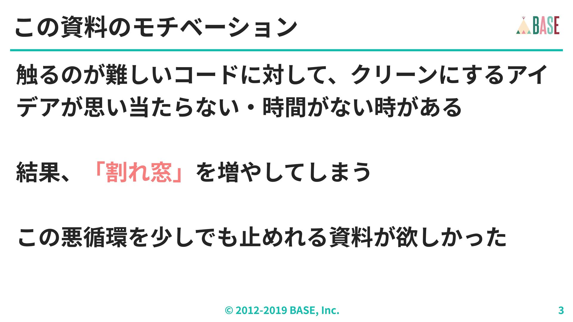 © - BASE, Inc. この資料のモチベーション 触るのが難しいコードに対して、クリーンにするアイ デアが思い当たらない‧時間がない時がある 結果、「割れ窓」を増やしてしまう この悪循環を少しでも⽌めれる資料が欲しかった