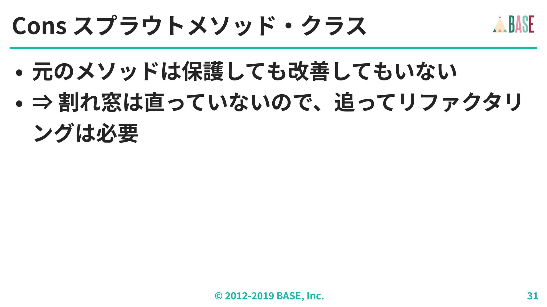 © - BASE, Inc. Cons スプラウトメソッド‧クラス • 元のメソッドは保護しても改善してもいない • ⇒