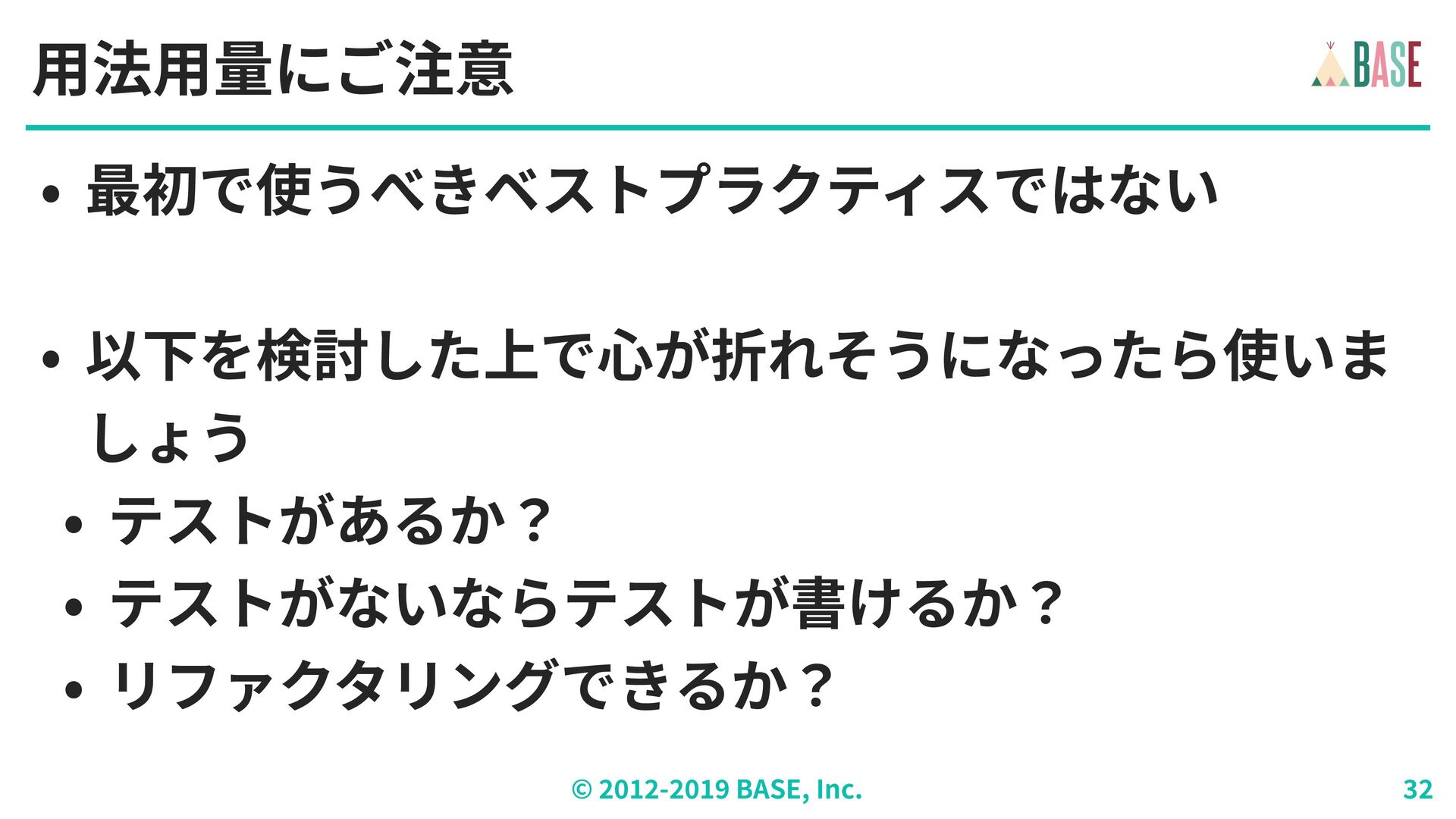© - BASE, Inc. ⽤法⽤量にご注意 • 最初で使うべきベストプラクティスではない • 以下を検討した上で⼼が折れそうになったら使いま しょう
