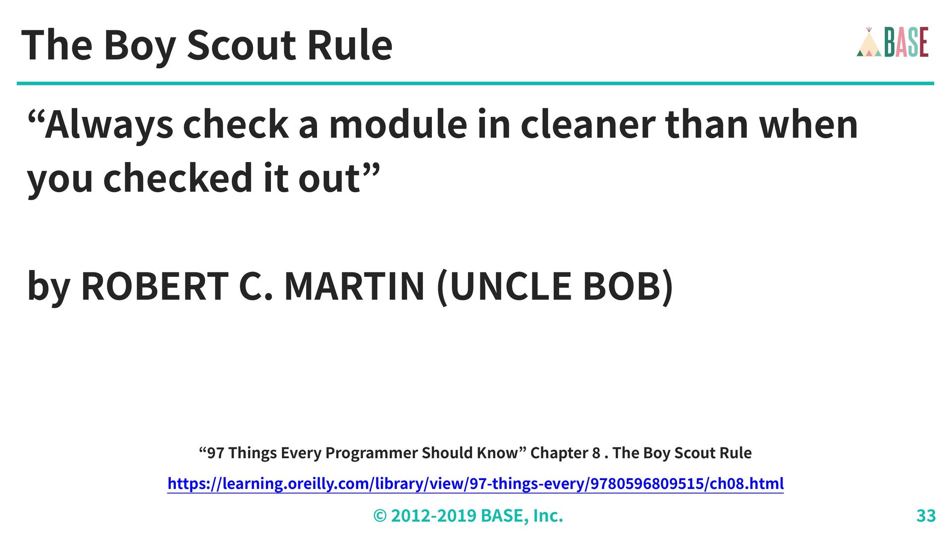 a module in cleaner than when you checked it out” by ROBERT C. MARTIN (UNCLE BOB) https://learning.oreilly.com/library/view/ -things-every/ /ch .html “ Things Every Programmer Should Know” Chapter . The Boy Scout Rule