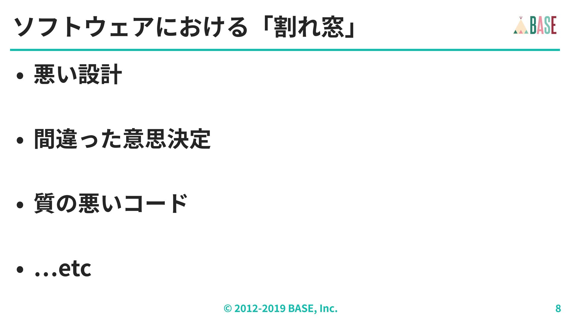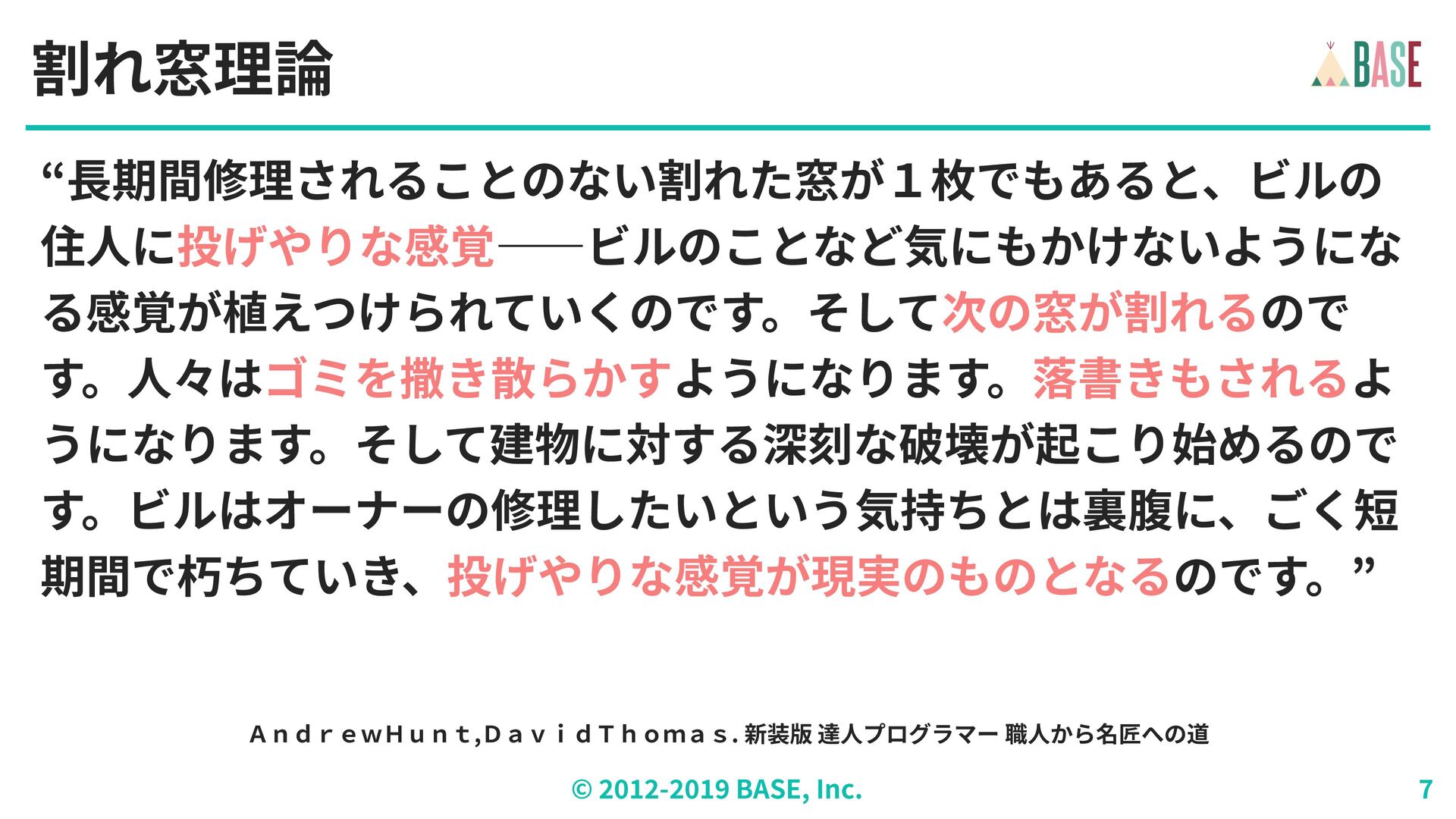 © - BASE, Inc. 「割れ窓」をどうすべきか “発⾒と同時にすべて修復するのです。もし正しく修 復するだけの⼗分な時間がないのであれば、その旨を わかりやすいところに明⽰しておくのです。” AndrewHunt,DavidThomas. 新装版
