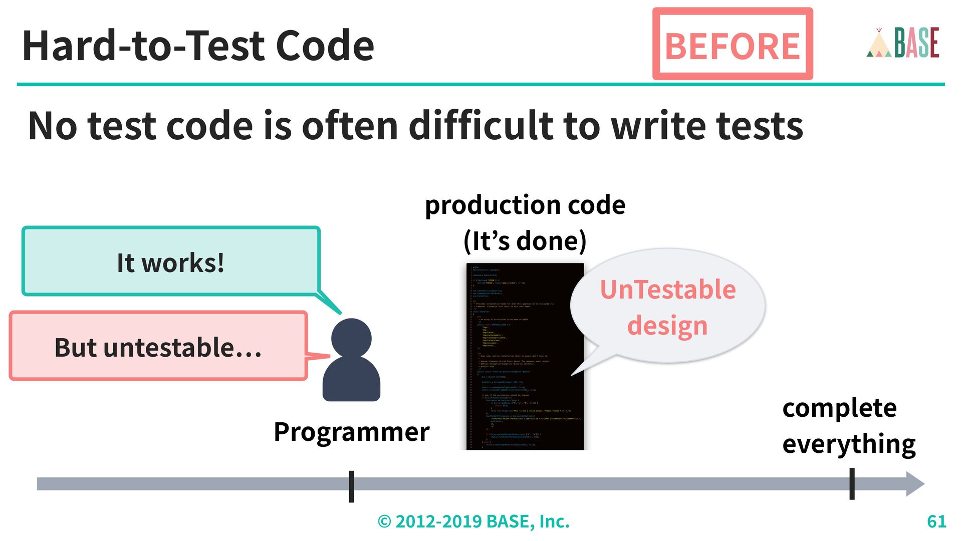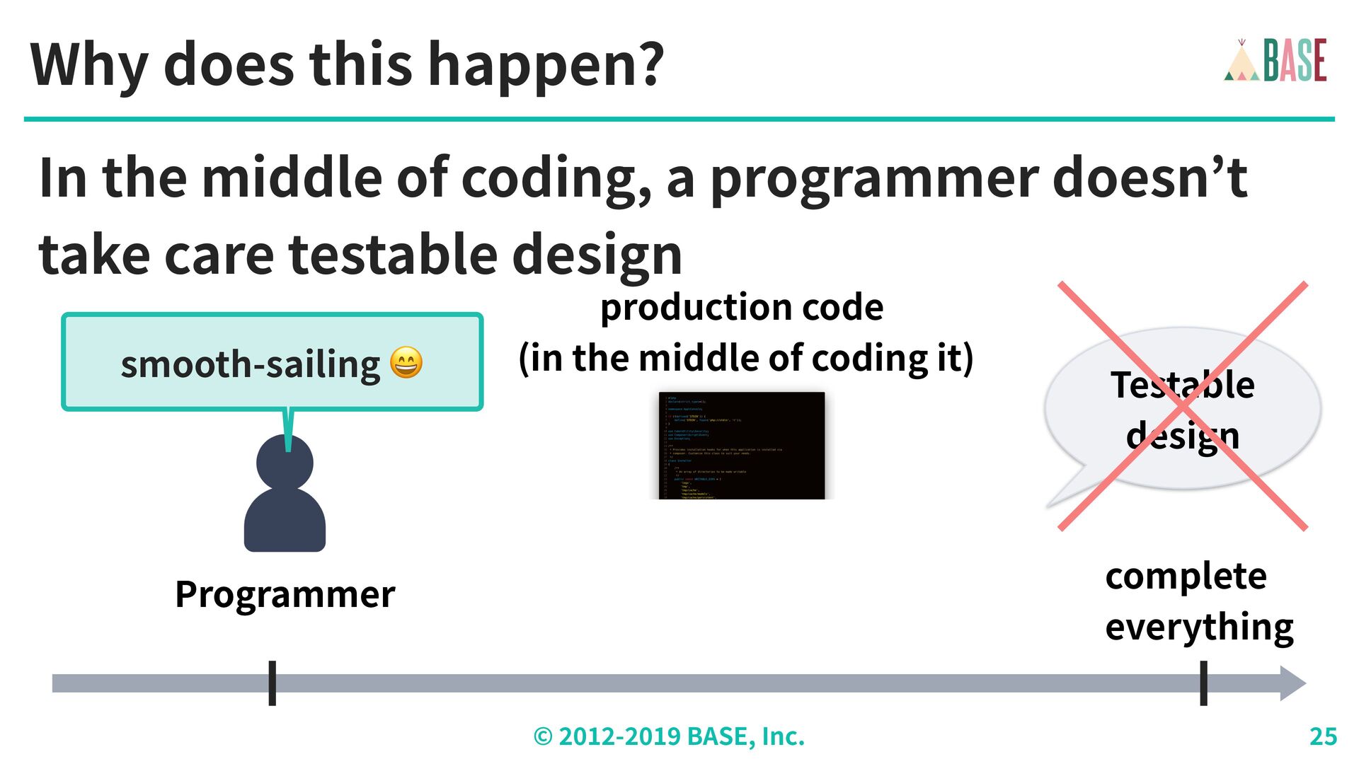smooth-sailing production code (in the middle of coding it) complete everything Testable design In the middle of coding, a programmer doesn’t take care testable design
