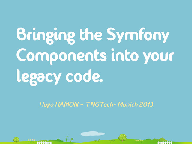 The same question comes every time when dealing with legacy code: shall we maintain or rewrite the whole application? Tough decision to take! Maintaining the legacy code or rewriting it from scratch may cost lots of money… Another solution would be to migrate the code from step to step by introducing new valuable pieces of software like Drupal does for their upcoming major release. This talk will explain how you can take benefit from famous Symfony2 standalone components to empower and modernize your legacy code. Reusing well known and tested Symfony components will also guarantee a smooth learning curve and the support from the biggest PHP developers community.
