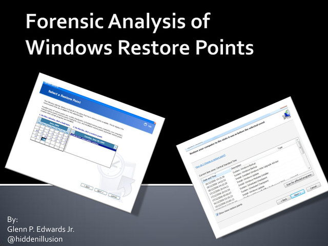 Carvey • Forensic Analysis of System Restore Points in Microsoft Windows XP by Kris Harms • http://www.mandiant.com/products/research/mandiant_restore_point_analyzer/download • Microsoft Windows Internals 4th Ed. By Mark Russinovich and David Soloman