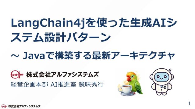 LangChain4jを使った生成AIシ ステム設計パターン 〜 Javaで構築する最新アーキテクチャ 経営企画本部 AI推進室 鏡味秀行 1
