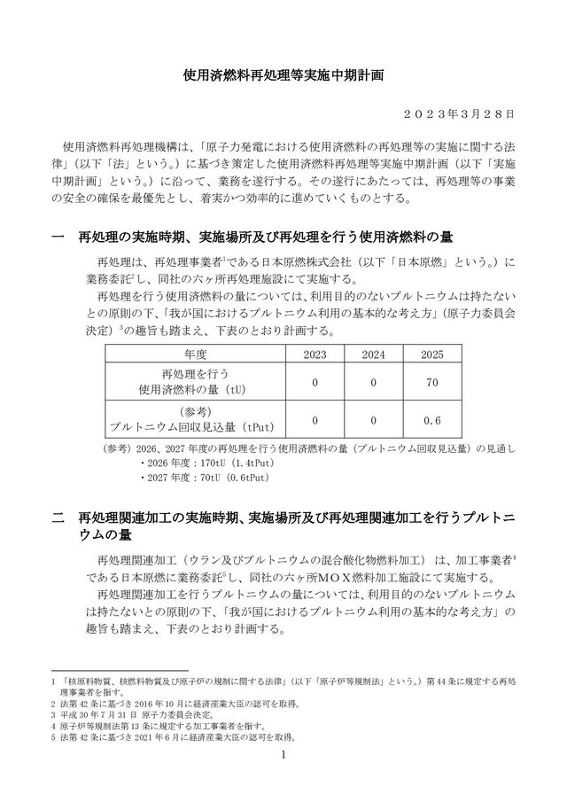 使用済燃料再処理機構が2023年3月28日に公表した使用済燃料再処理等実施中期計画。