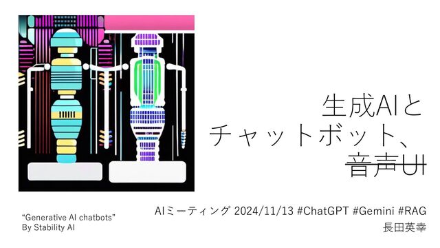 AIミーティング 2024/11/13 #ChatGPT #Gemini #RAG https://osaka-driven-dev.connpass.com/event/334176/ 「生成AIとチャットボット、音声UI」登壇資料です。