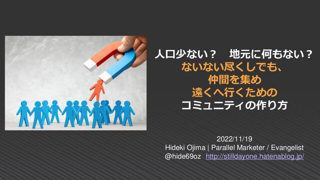 人口少ない? 地元に何もない? ないない尽くしでも、 仲間を集め 遠くへ行くための コミュニティの作り方 2022/11/19 Hideki Ojima |