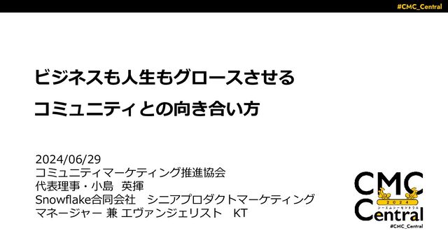 2024/06/29 開催 CMC_Central でのKTx小島のクロージングトークセッションの進行スライドです。 ・ビジネス成長に不可欠になるコミュニティ ・「コミュニティ越境」とキャリア形成 ・マルチコミュニティのススメ についてお話しています。