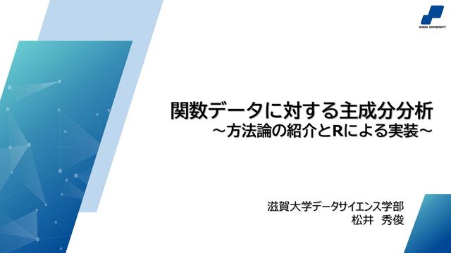 ベクトルとして扱っていたものを関数として扱う 参考文献: – Ramsay, J. O. and Silverman, B. W. (2005) Functional Data Analysis 2nd ed. Springer. – R package “fda” https://cran.r-project.org/web/packages/fda/index.html – 小西貞則 (2010). 多変量解析入門.朝倉書店 – Green, P. and Silverman, B. W. (1993). Nonparametric Regression and Generalized Linear Models. Chapman and Hall/CRC. まとめ