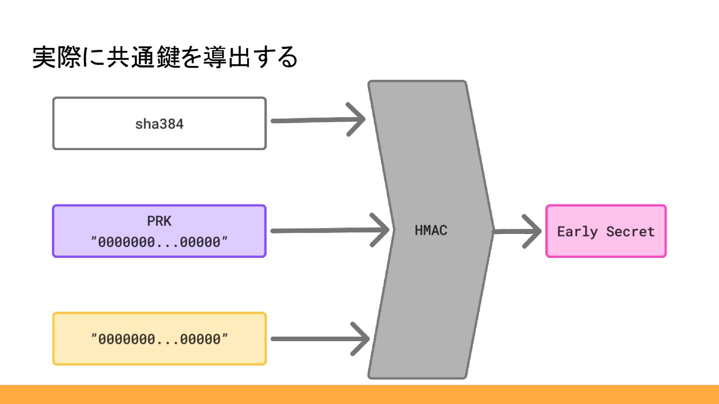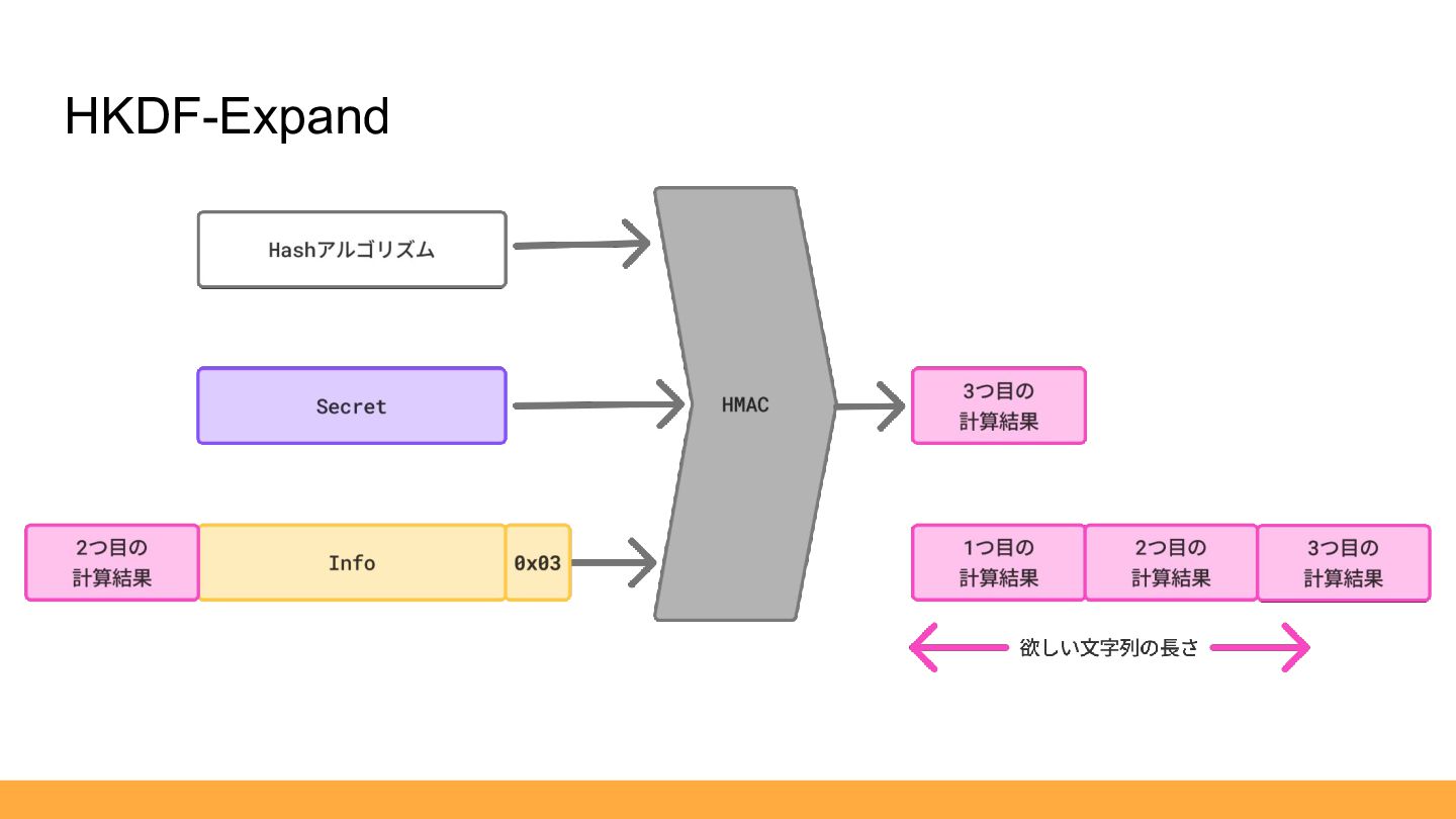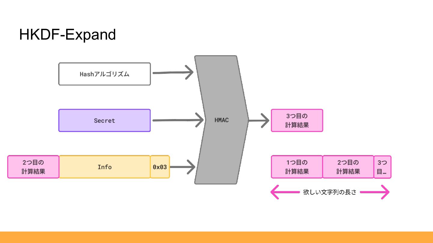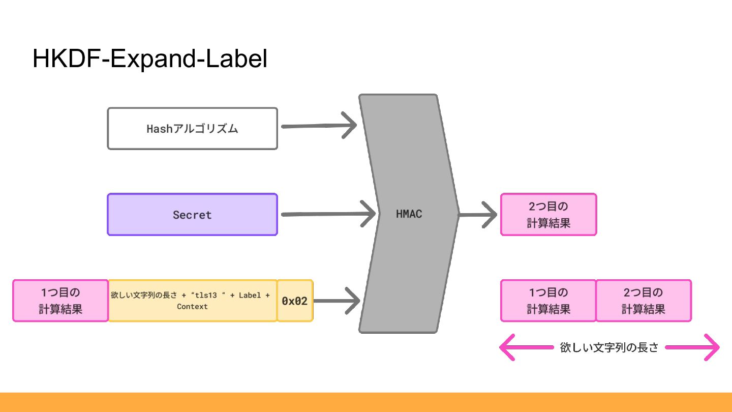 1. ClientHelloで「Secretの元」を受け取る 2. 「Secretの元」を加工して、「Secret(鍵の元)」を生成 3. 「Secret(鍵の元)」から「鍵」と「IV」を生成 鍵導出流れ