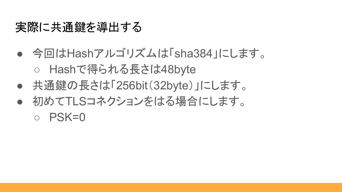 • 今回はHashアルゴリズムは「sha384」にします。 ◦ Hashで得られる長さは48byte • 共通鍵の長さは「256bit(32byte)」にします。 • 初めてTLSコネクションをはる場合にします。 ◦ PSK=0