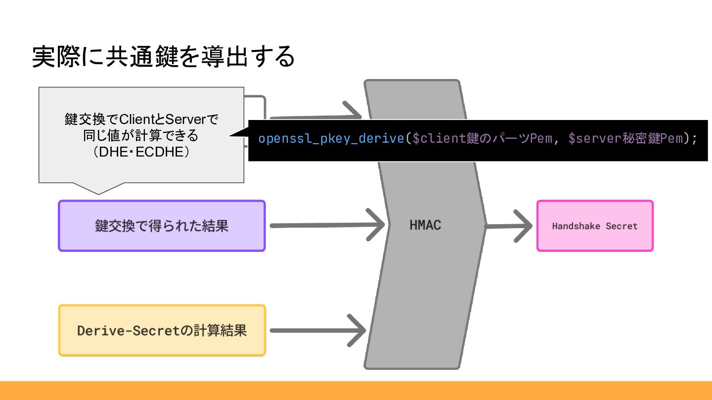 実際に共通鍵を導出する 鍵交換でClientとServerで 同じ値が計算できる (DHE・ECDHE) openssl_pkey_derive($client鍵のパーツPem, $server秘密鍵Pem);