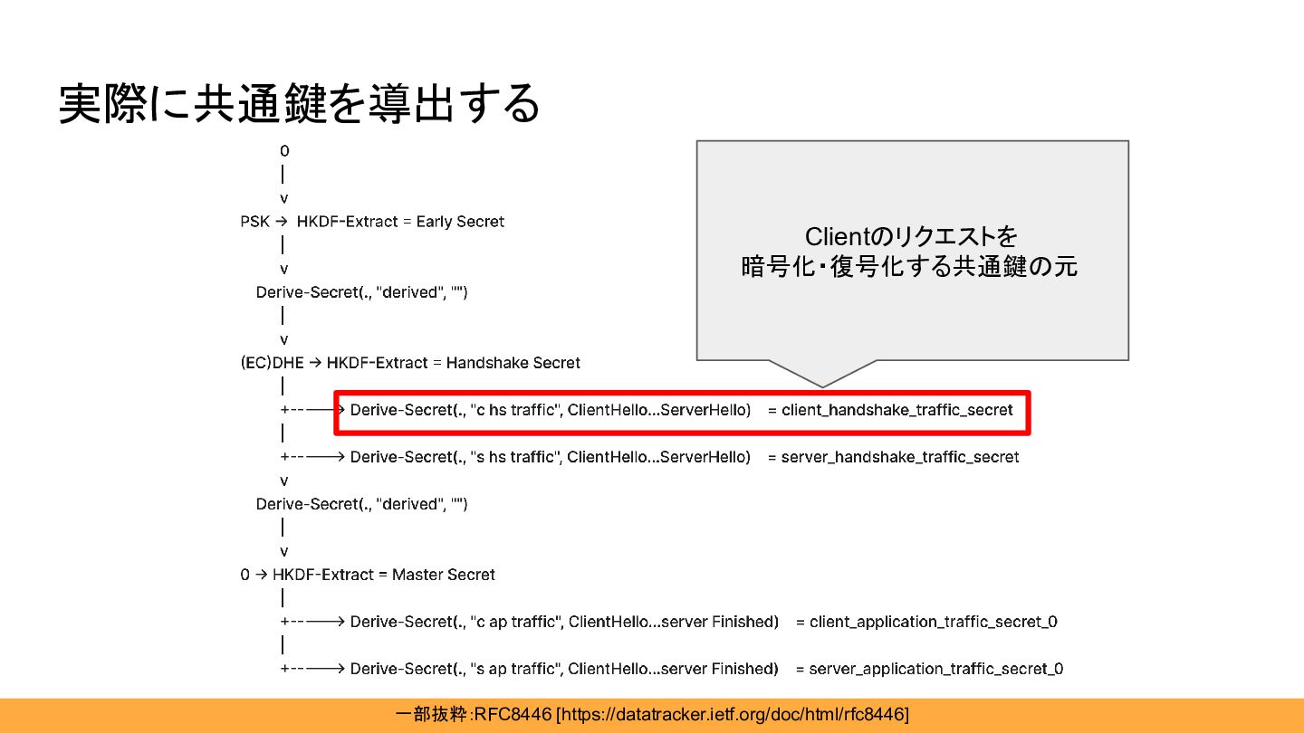実際に共通鍵を導出する 一部抜粋:RFC8446 [https://datatracker.ietf.org/doc/html/rfc8446] Clientのリクエストを 暗号化・復号化する共通鍵の元