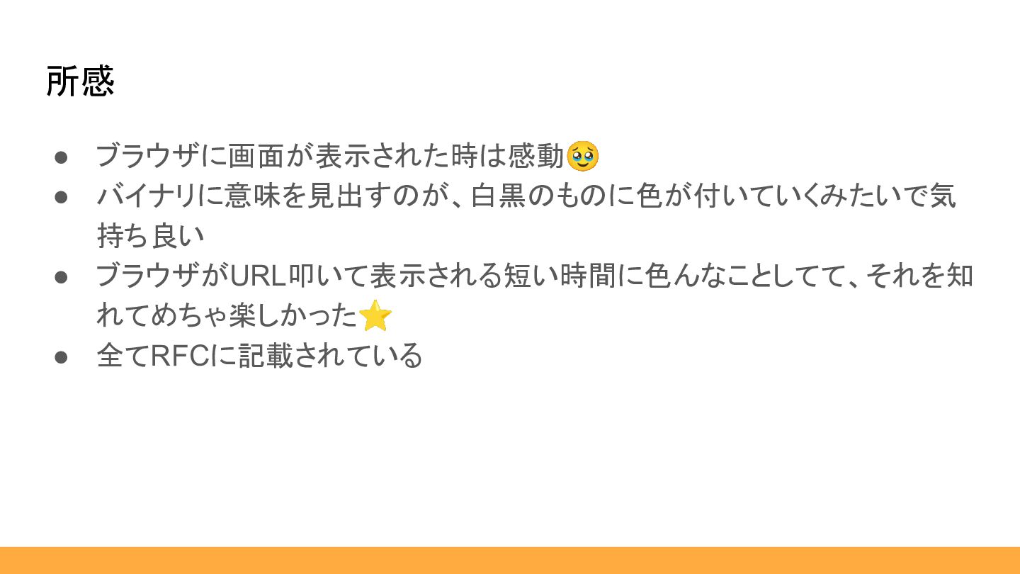 • ブラウザに画面が表示された時は感動🥹 • バイナリに意味を見出すのが、白黒のものに色が付いていくみたいで気 持ち良い • ブラウザがURL叩いて表示される短い時間に色んなことしてて、それを知 れてめちゃ楽しかった⭐ • 全てRFCに記載されている