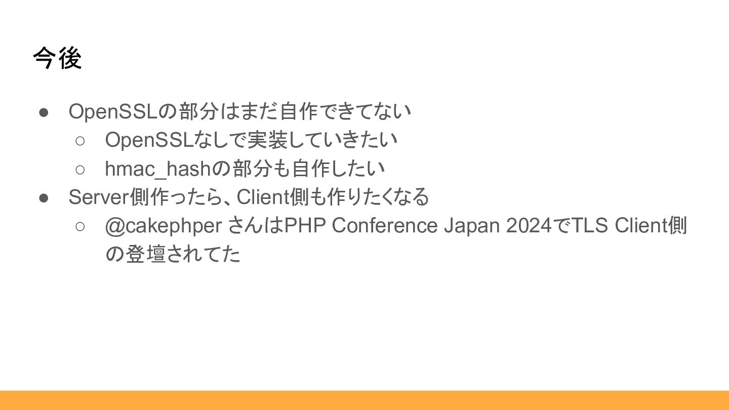 • OpenSSLの部分はまだ自作できてない ◦ OpenSSLなしで実装していきたい ◦ hmac_hashの部分も自作したい • Server側作ったら、Client側も作りたくなる ◦ @cakephper