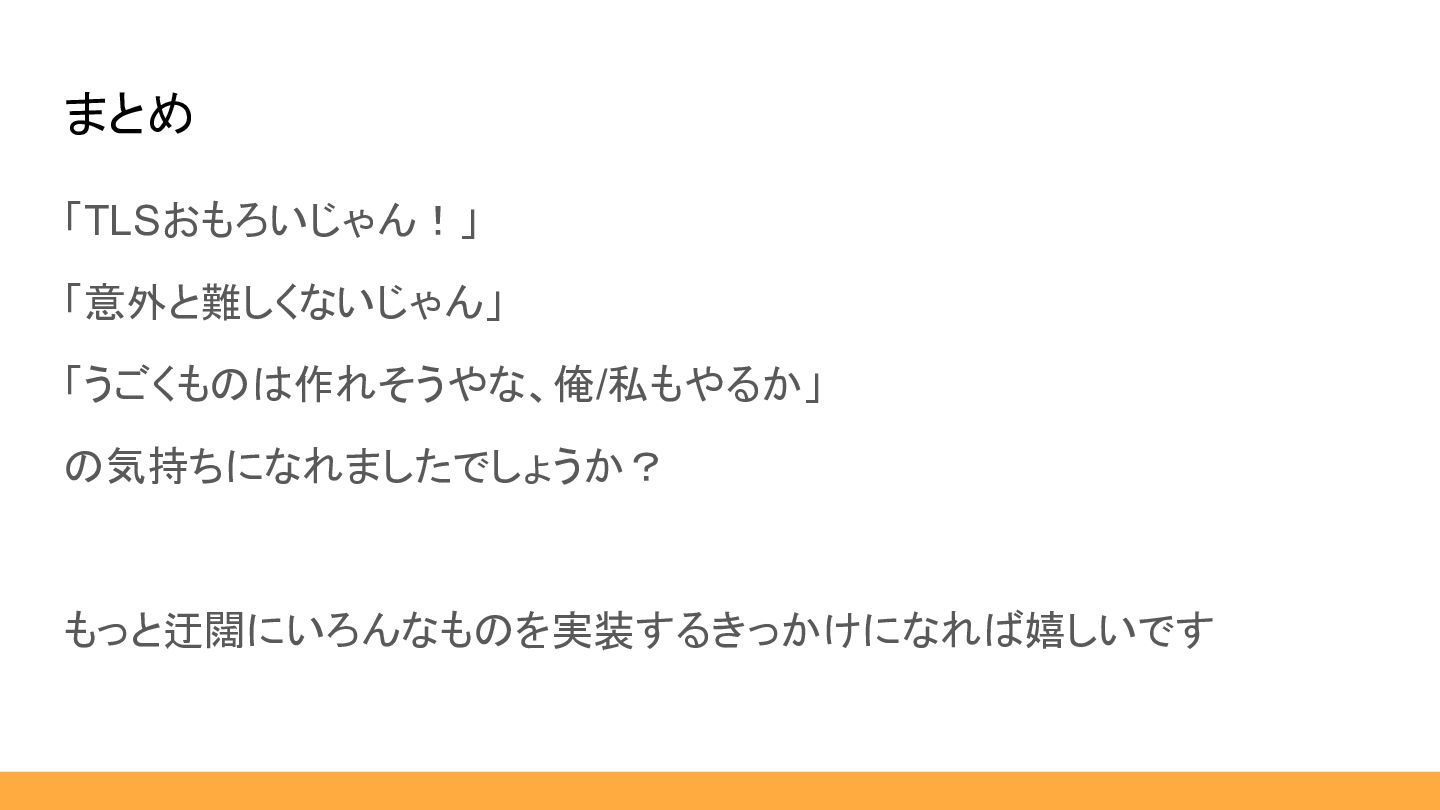 まとめ 「TLSおもろいじゃん!」 「意外と難しくないじゃん」 「うごくものは作れそうやな、俺/私もやるか」 の気持ちになれましたでしょうか? もっと迂闊にいろんなものを実装するきっかけになれば嬉しいです