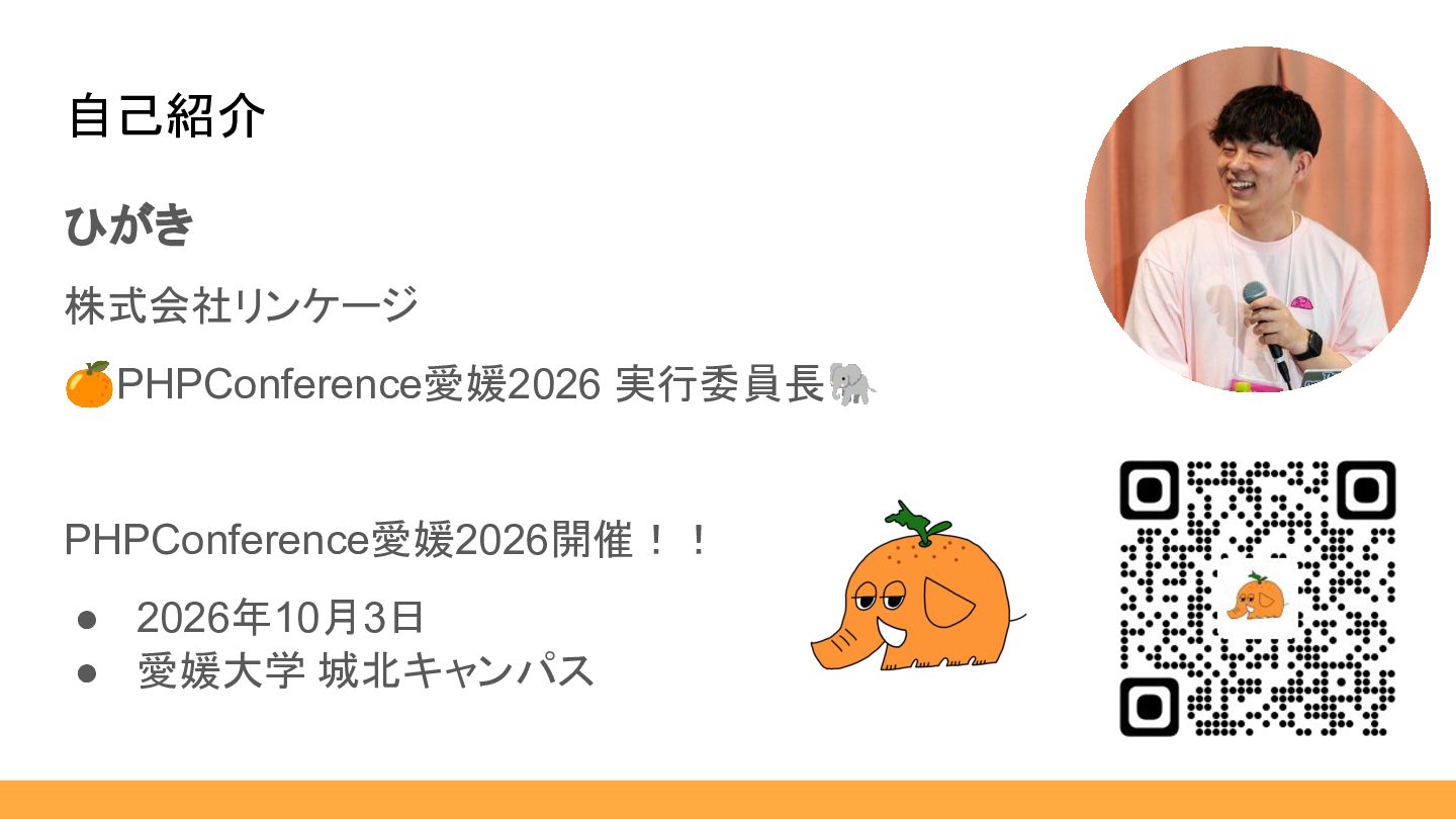ひがき 株式会社リンケージ 🍊PHPConference愛媛2026 実行委員長🐘 PHPConference愛媛2026開催!! • 2026年10月3日 • 愛媛大学 城北キャンパス